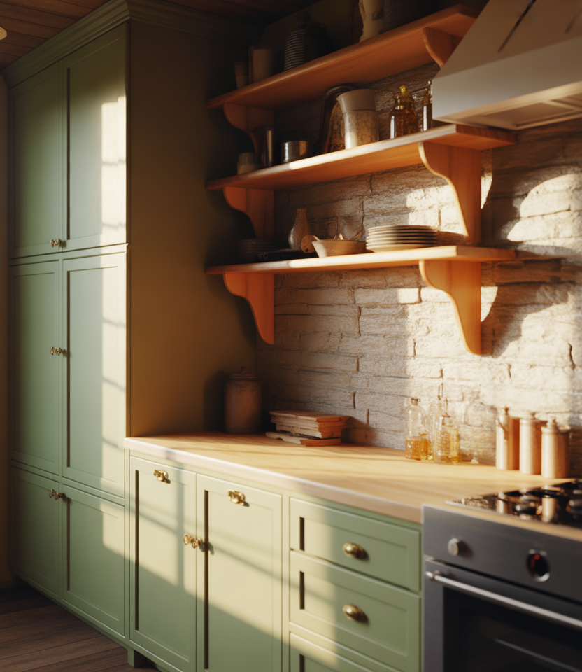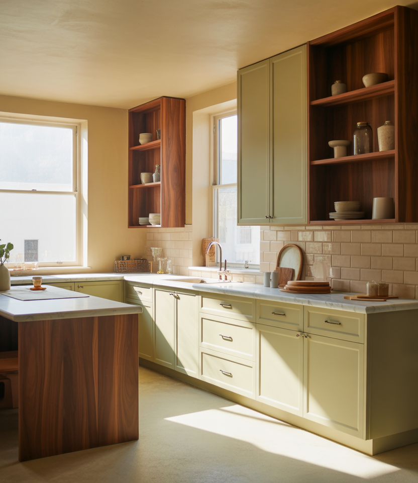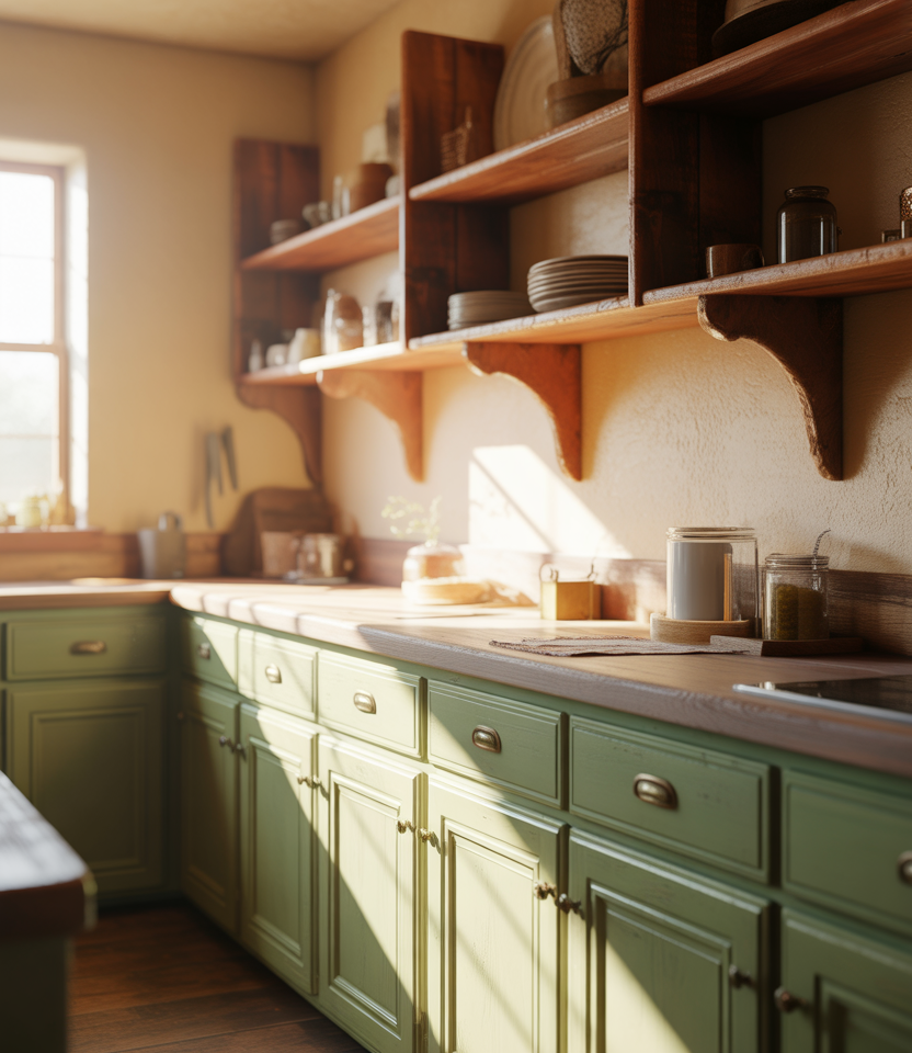 Soft green cabinetry and accents are defining modern farmhouse kitchens in 2026. These hues feel organic without being trendy, pairing effortlessly with wood, stone, and creamy whites. Often described as “heritage greens,” they add depth while preserving the calm, grounded feeling homeowners crave.