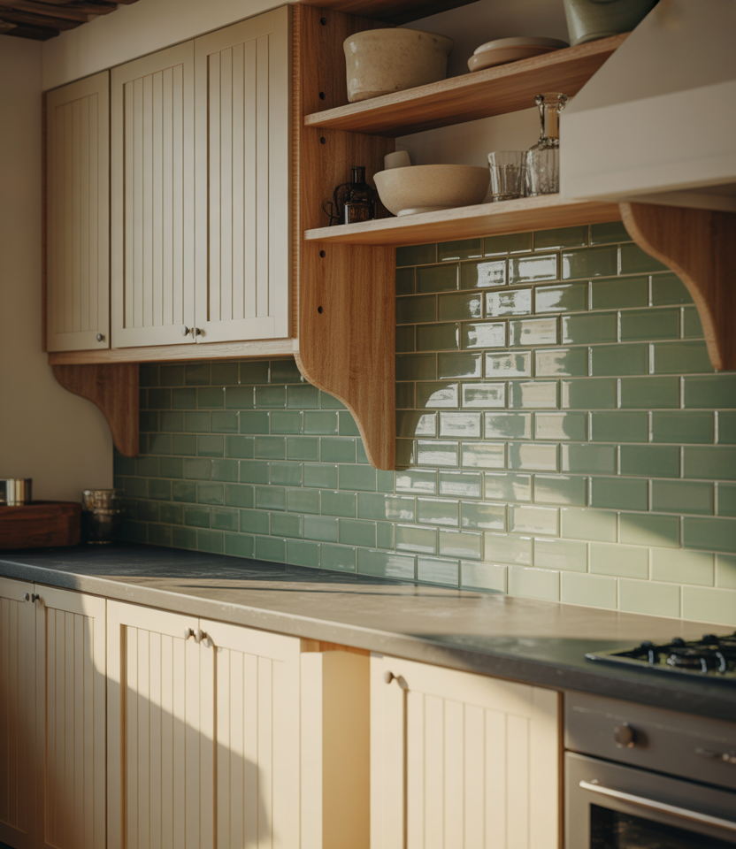 Green in 2026 isn’t limited to cabinetry. Tile, painted islands, and even ceiling accents bring freshness to modern farmhouse kitchens without overwhelming them. These touches pair well with natural materials and evolving design ideas.
