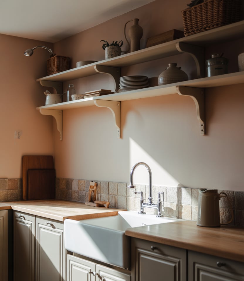 The farmhouse sink wall becomes more intentional in modern farmhouse kitchens in 2026. Thoughtful spacing, open shelving, and subtle counter decor transform a purely functional zone into a calming focal point.