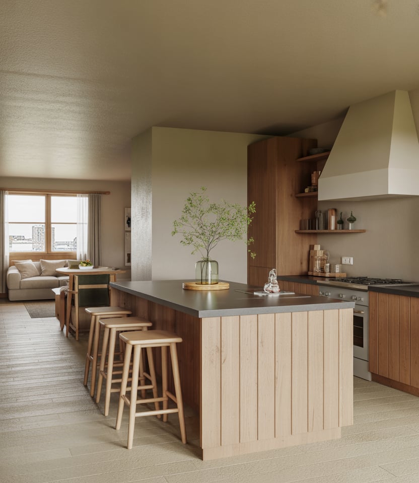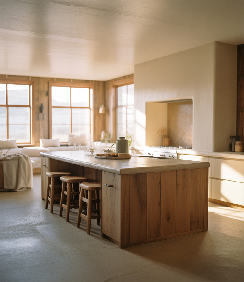The kitchen island is no longer just extra counter space—it’s the visual anchor. In modern farmhouse kitchens in 2026, islands often contrast surrounding cabinetry through deeper stains, painted finishes, or thicker silhouettes. Generous overhangs encourage gathering, while integrated storage keeps clutter out of sight. The island quietly connects kitchen, dining, and even living room zones.