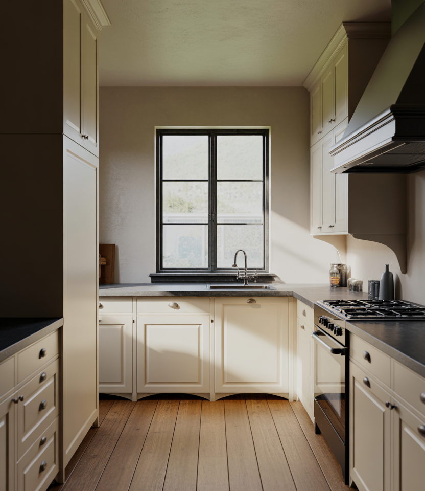 The classic black and white farmhouse kitchen gets a quieter update in 2026. Instead of sharp contrast, designers soften the look with warm whites, charcoal blacks, and natural materials. This approach keeps the palette timeless while allowing countertops and textures to add personality rather than drama.