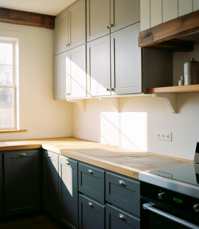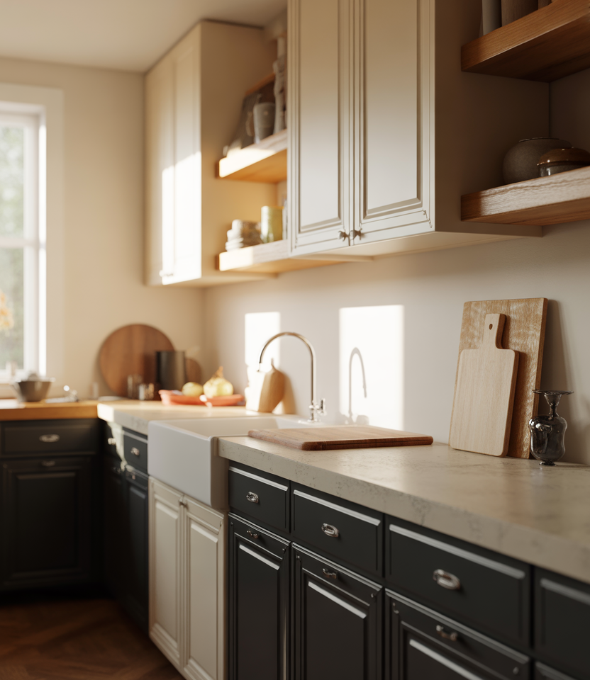 The trend of black lower cabinets and white upper configurations continues to gain traction. This layout visually grounds the kitchen while keeping upper sightlines light and open. In modern farmhouse kitchens in 2026, it’s often paired with simple countertops to balance contrast and avoid visual clutter.