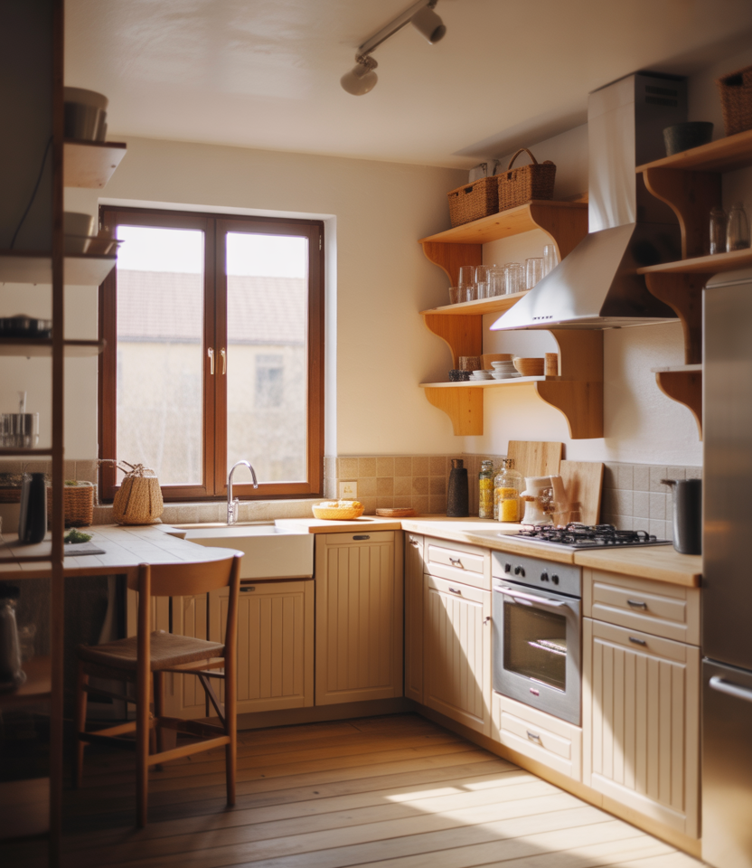 Even a small space can embrace modern farmhouse style. In 2026, compact kitchens rely on smart layouts, open shelving, and light-reflective colors to feel larger. Clean lines and fewer upper cabinets keep the room from feeling crowded.