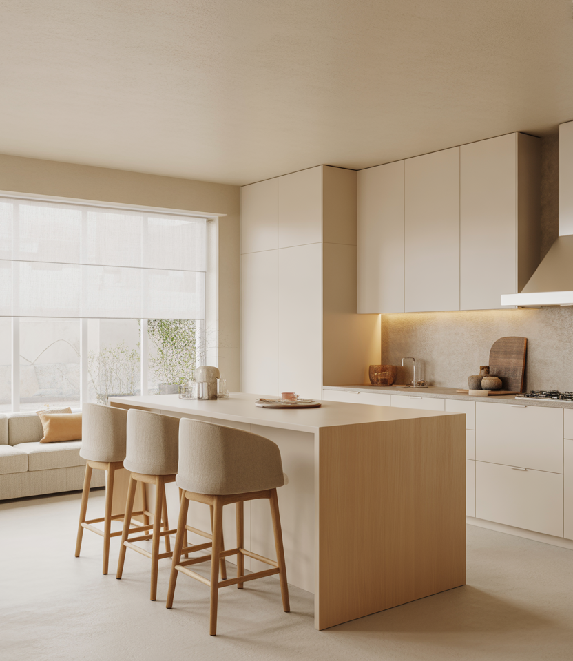 In 2026, minimal kitchens are losing their cold edge. Designers are pairing minimalist layouts with organic textures and white foundations that feel calm rather than stark. Flat-front cabinets, pale oak details, and softly rounded islands create kitchens that look edited but welcoming, especially in open-plan homes.