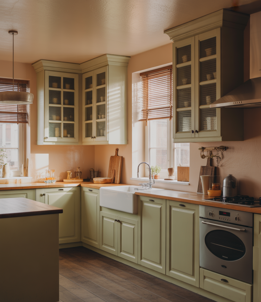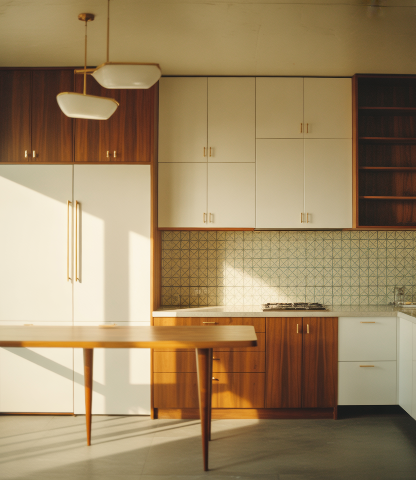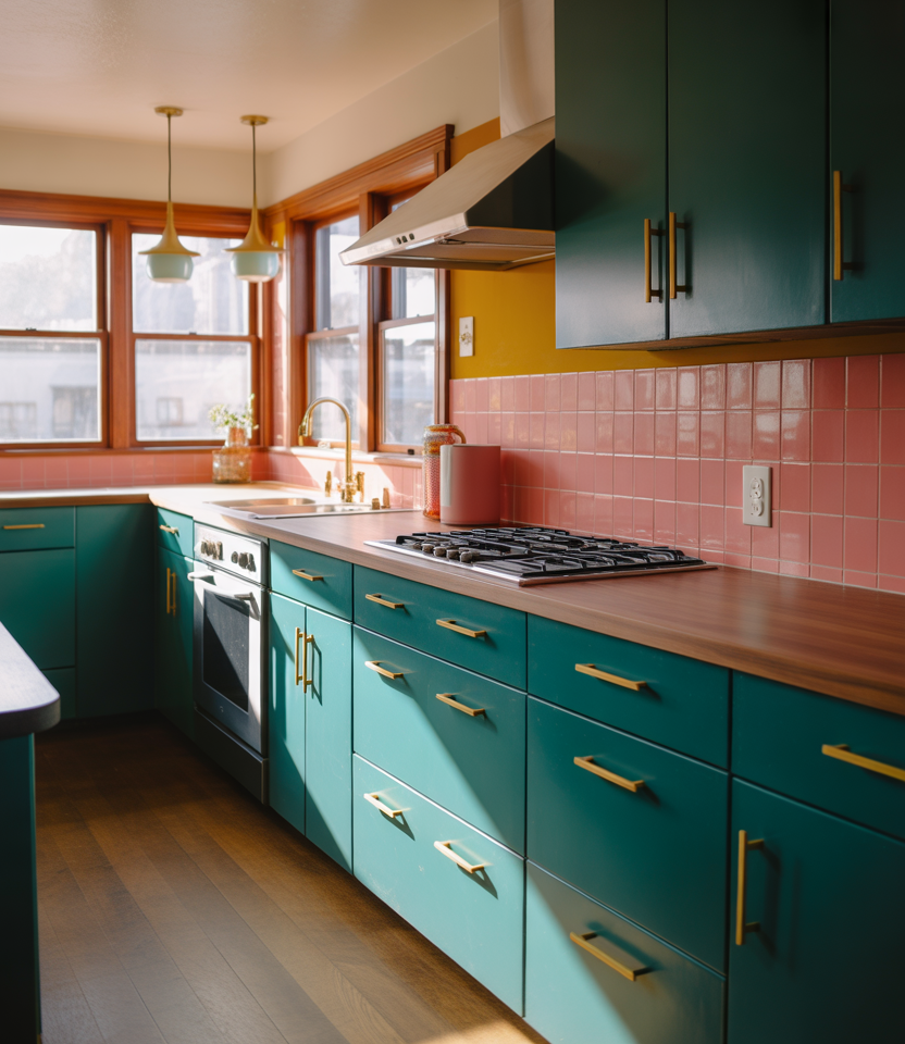 Color is returning in confident ways. Colorful mid-century kitchens mix retro hues with modern restraint, often layered with retro references and aesthetic balance. Think muted teal cabinets, mustard accents, and warm woods paired with clean-lined appliances.