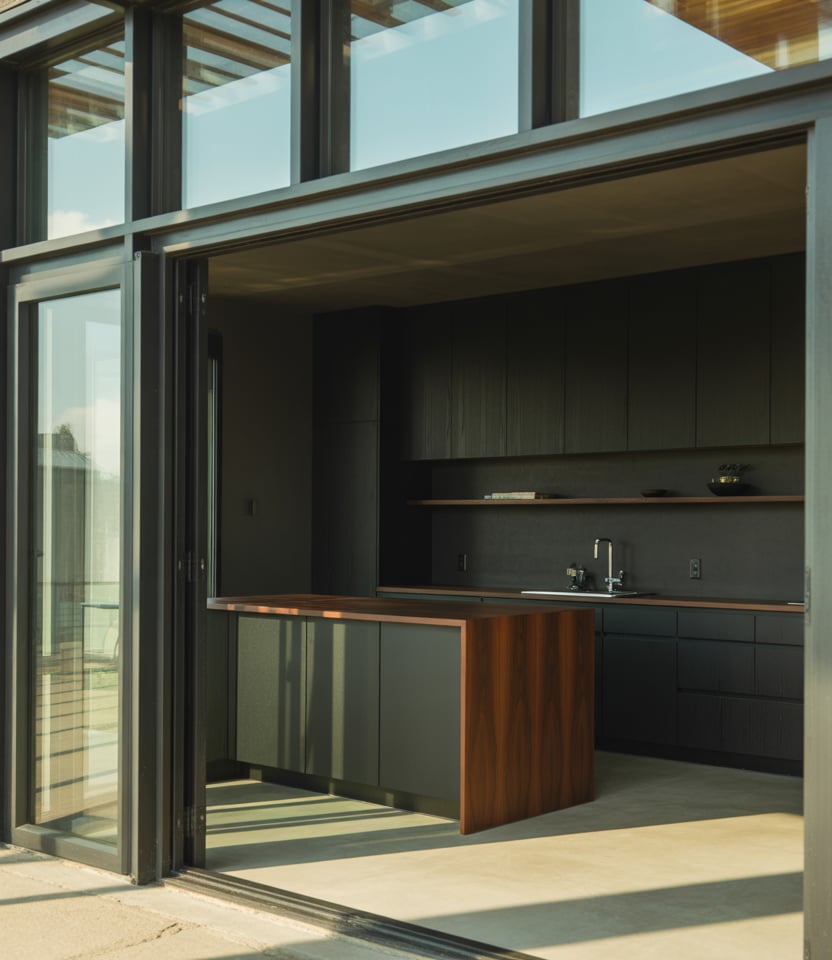 Dark kitchens are being designed around light. Deep finishes paired with dark cabinetry feel fresh when balanced by large windows and warm materials. The contrast creates drama without sacrificing openness or comfort.