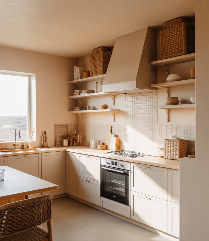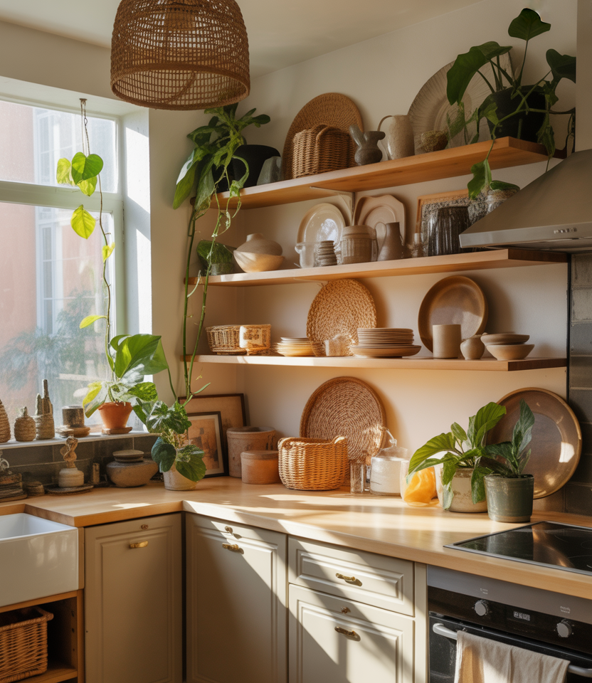 Boho style is becoming more architectural. In 2026, boho kitchens rely on clean layouts layered with texture and vintage accents. Open shelving, handmade tile, and natural fibers add personality without visual clutter.