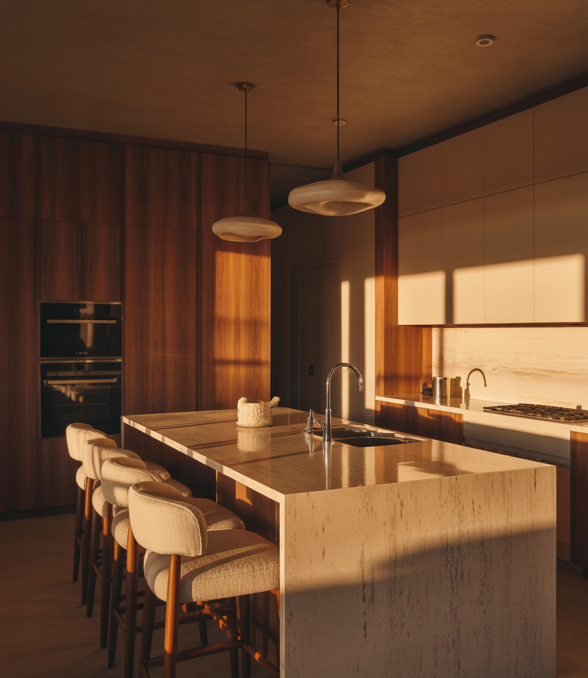 Luxury kitchens are becoming less about flash and more about comfort. High-end finishes meet luxury sensibility through contemporary layouts softened by cozy lighting and tactile materials. Statement islands anchor the room without feeling formal.