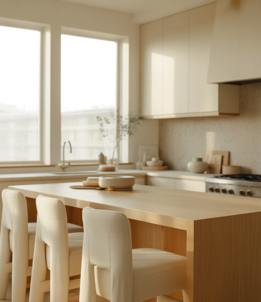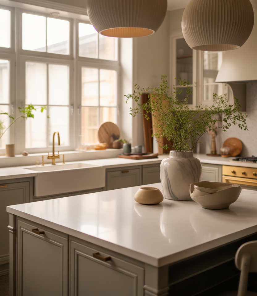 Designers often describe this look as “quiet luxury.” The value comes from material quality and proportion rather than decoration. It works especially well for homeowners who want a calming kitchen that still feels elevated enough for entertaining and everyday enjoyment.