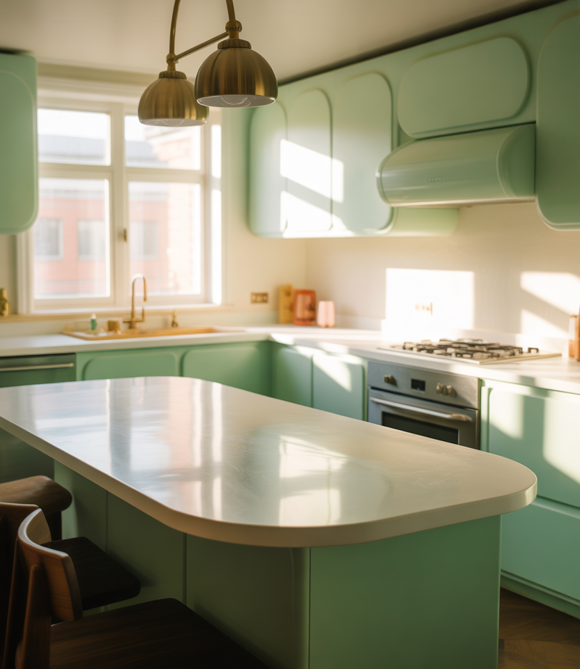 Retro kitchens are returning with a lighter hand. In 2026, designers blend retro charm with contemporary layouts, often softened by white surfaces and modern appliances. Curved corners, pastel accents, and vintage-style hardware feel nostalgic without turning kitschy.
