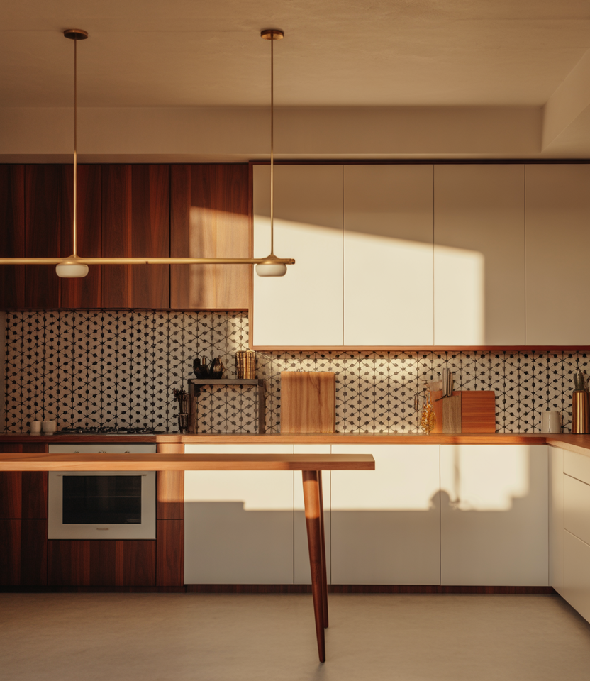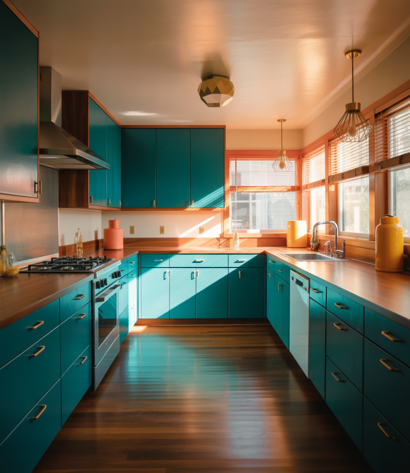 Color is returning in confident ways. Colorful mid-century kitchens mix retro hues with modern restraint, often layered with retro references and aesthetic balance. Think muted teal cabinets, mustard accents, and warm woods paired with clean-lined appliances.