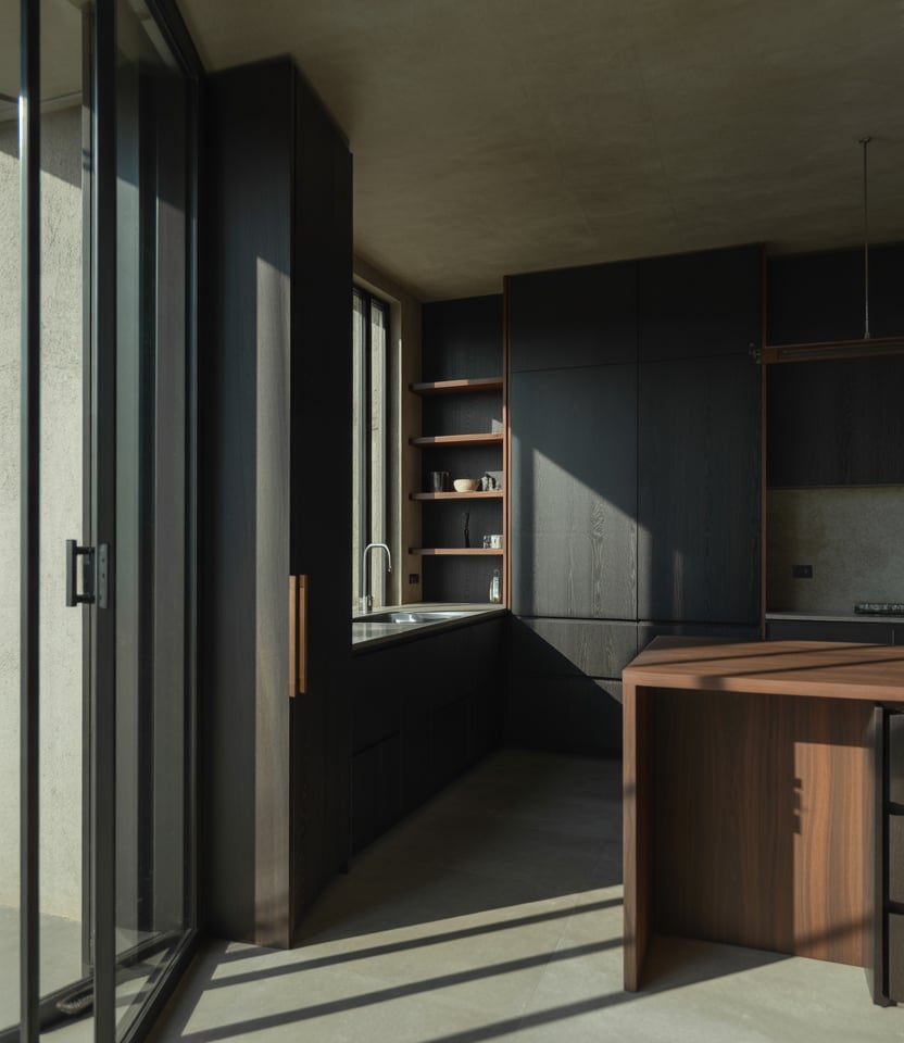 Dark kitchens are being designed around light. Deep finishes paired with dark cabinetry feel fresh when balanced by large windows and warm materials. The contrast creates drama without sacrificing openness or comfort.