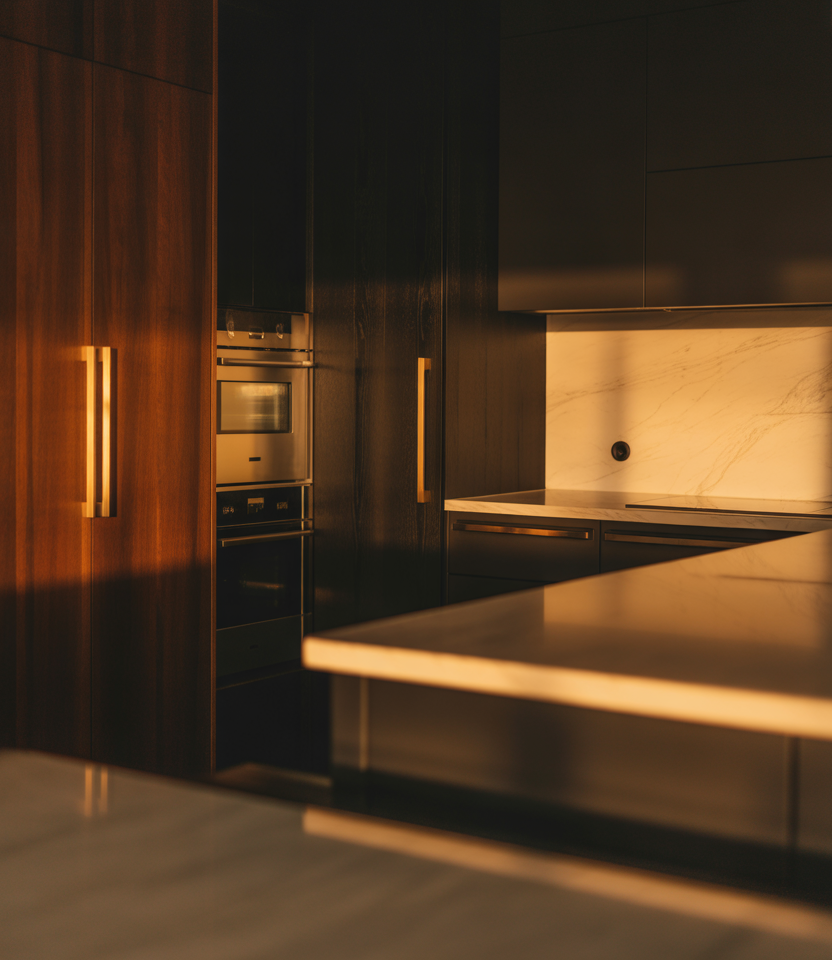 Luxury kitchens are becoming less about flash and more about comfort. High-end finishes meet luxury sensibility through contemporary layouts softened by cozy lighting and tactile materials. Statement islands anchor the room without feeling formal.