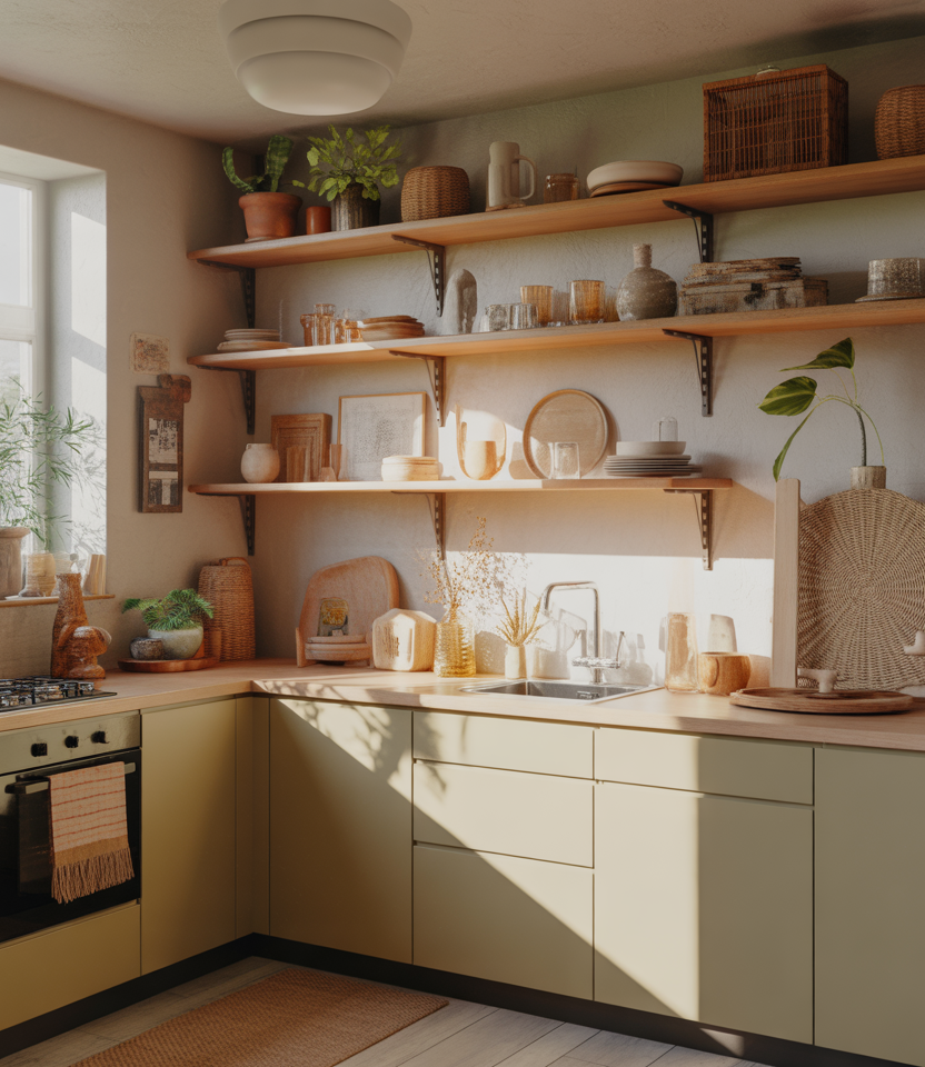 Boho style is becoming more architectural. In 2026, boho kitchens rely on clean layouts layered with texture and vintage accents. Open shelving, handmade tile, and natural fibers add personality without visual clutter.