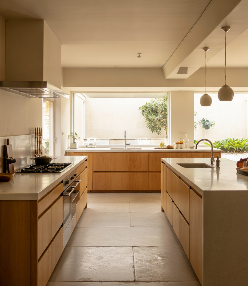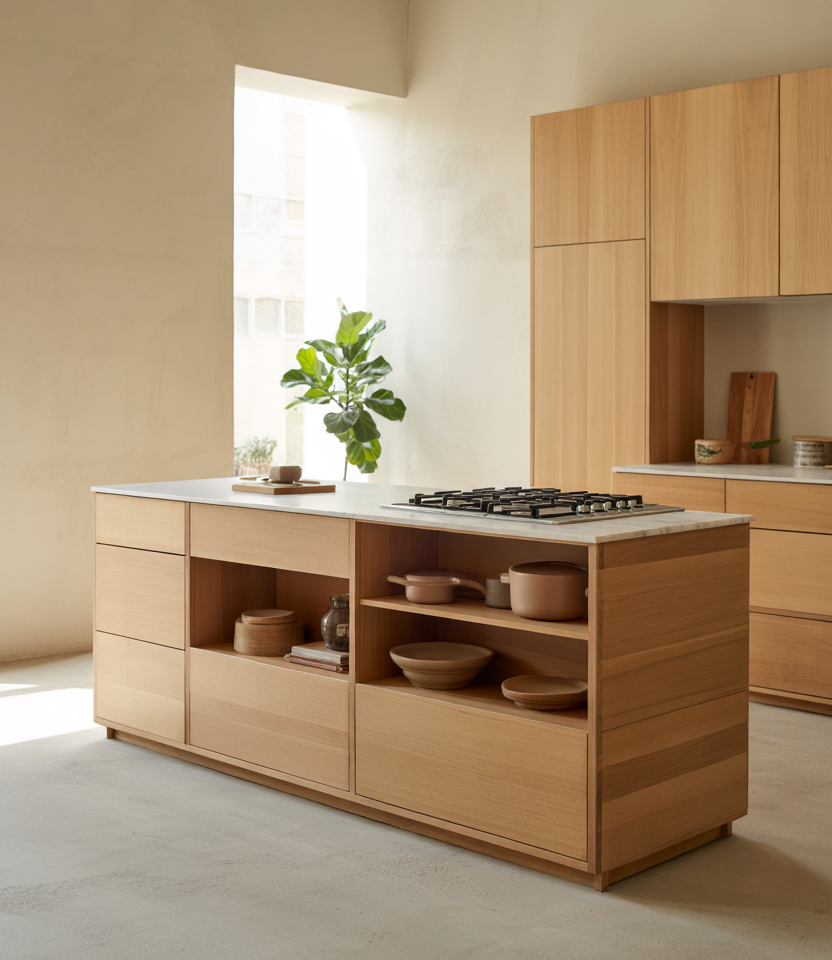 Minimalism is softening, leaning into gentle woods and earthy tones. The combination of modern ideas, refined design, a small Indian touch, and an aesthetic focused on warmth gives the kitchen personality without unnecessary ornamentation. Common mistakes and how to avoid them: too much minimalism can feel cold. Introduce subtle texture, warm metals, or a natural stone to keep the space grounded.