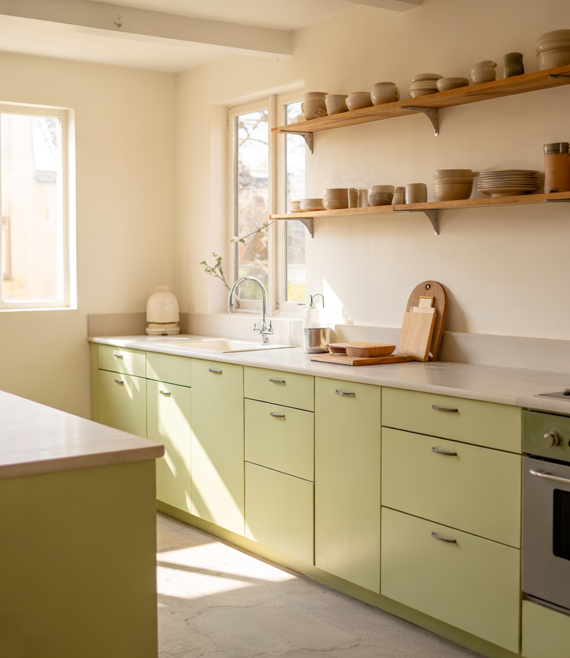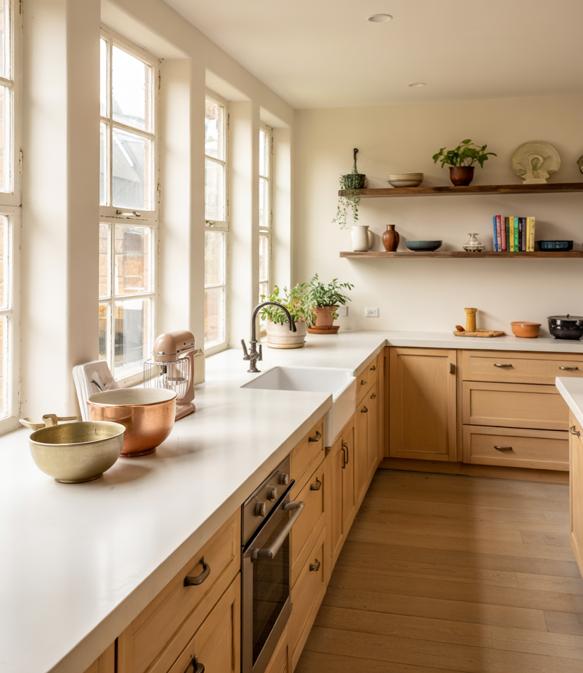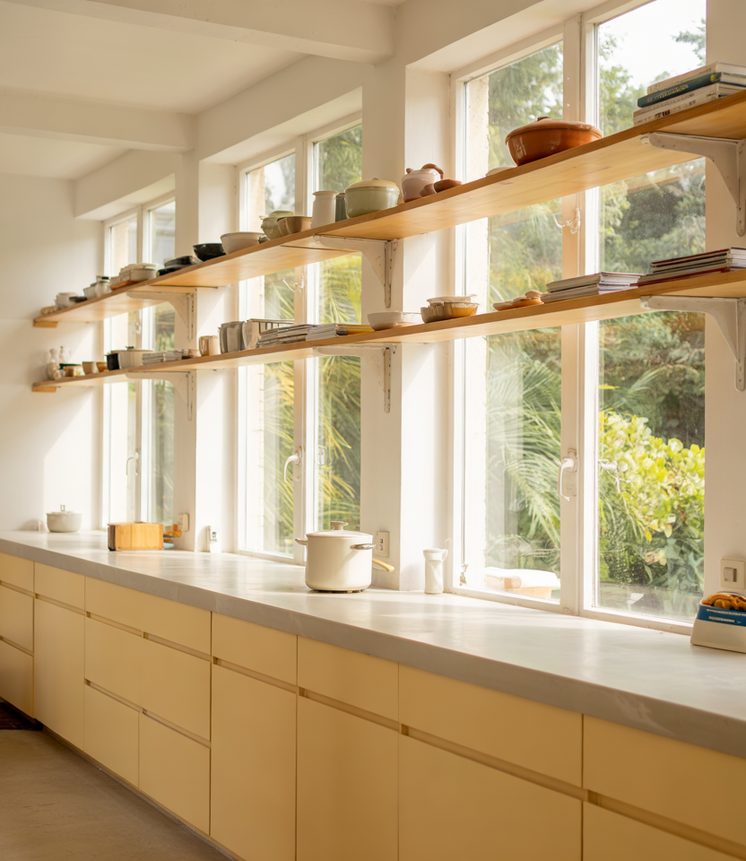 Kitchens with prep counters lined directly up against large window spans feel light and airy. Tucking slim shelving and a few design ideas into this type of layout turns daylight into a design element. A bit of modern design detail can help bring the frame and cabinetry together. Where it works best: homes with garden views or even modest yards—the expanded sightline makes smaller kitchens feel significantly larger.