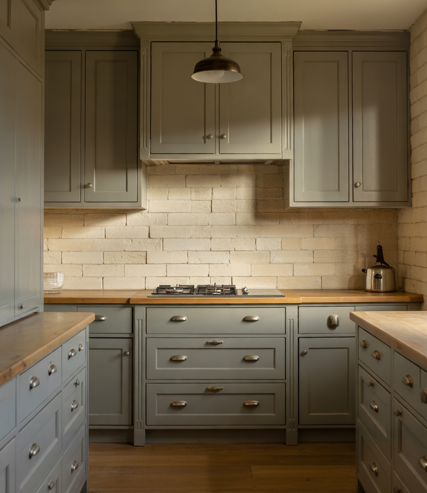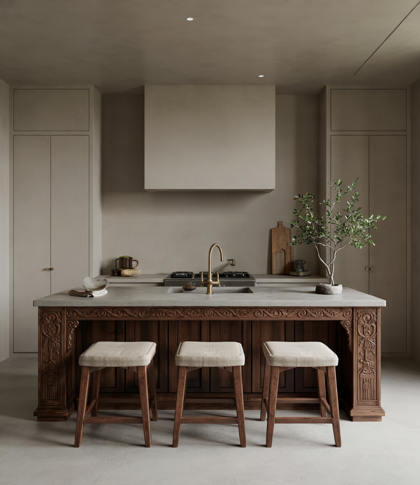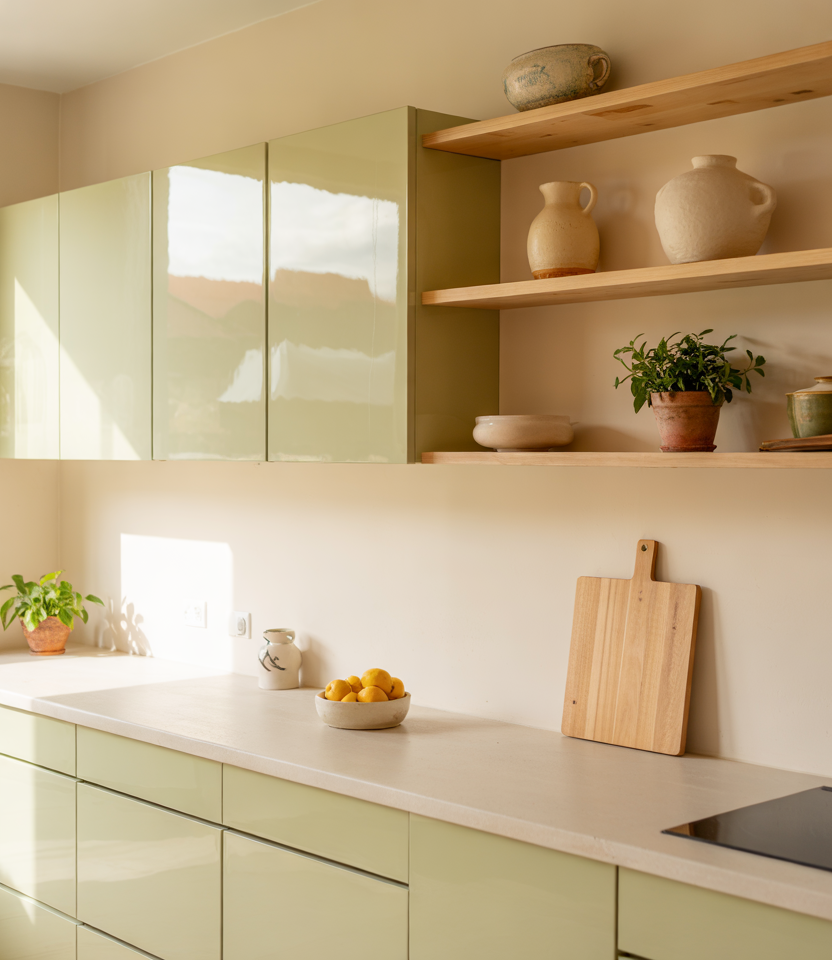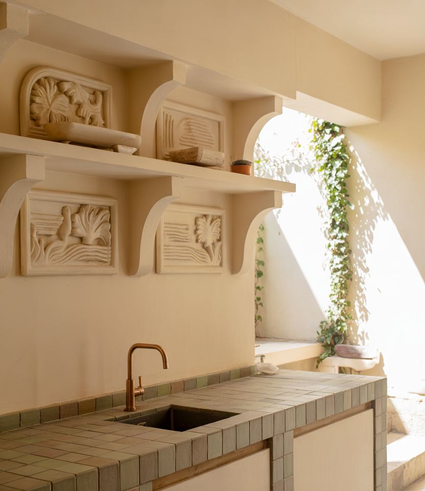 Hand-shaped wood details—from carved drawer fronts to softly rounded shelves—bring a crafted warmth that blends beautifully with wooden tones and light design decor touches. Adding a hint of modern design contrast keeps the look refreshed, while subtle green accents tie everything back to nature. Real homeowner behavior: many people are choosing handmade wooden accessories or custom trims to add uniqueness without fully remodeling cabinetry.