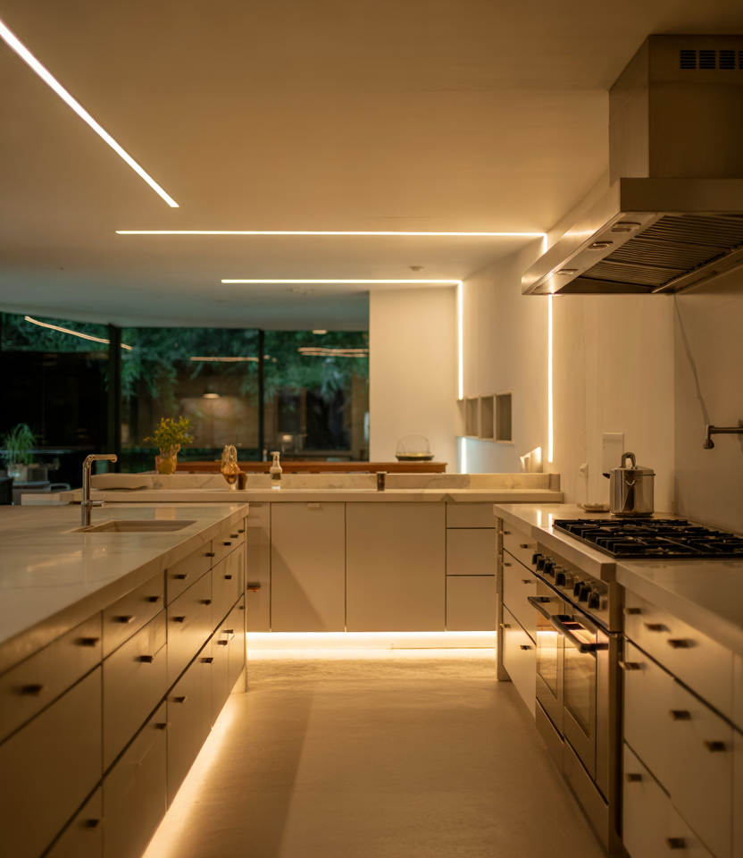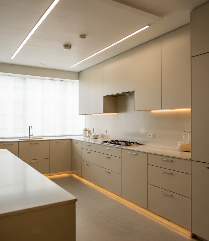Long LED bars beneath upper cabinets and along toe-kick edges give a sleek glow. This subtle illumination pairs beautifully with streamlined-shaped hardware and restrained design decor touches. A whisper of luxury emerges without overpowering the room’s simplicity. Practical insight: linear lighting brightens prep zones more evenly than puck lights and reduces harsh shadows, making everyday cooking noticeably easier.