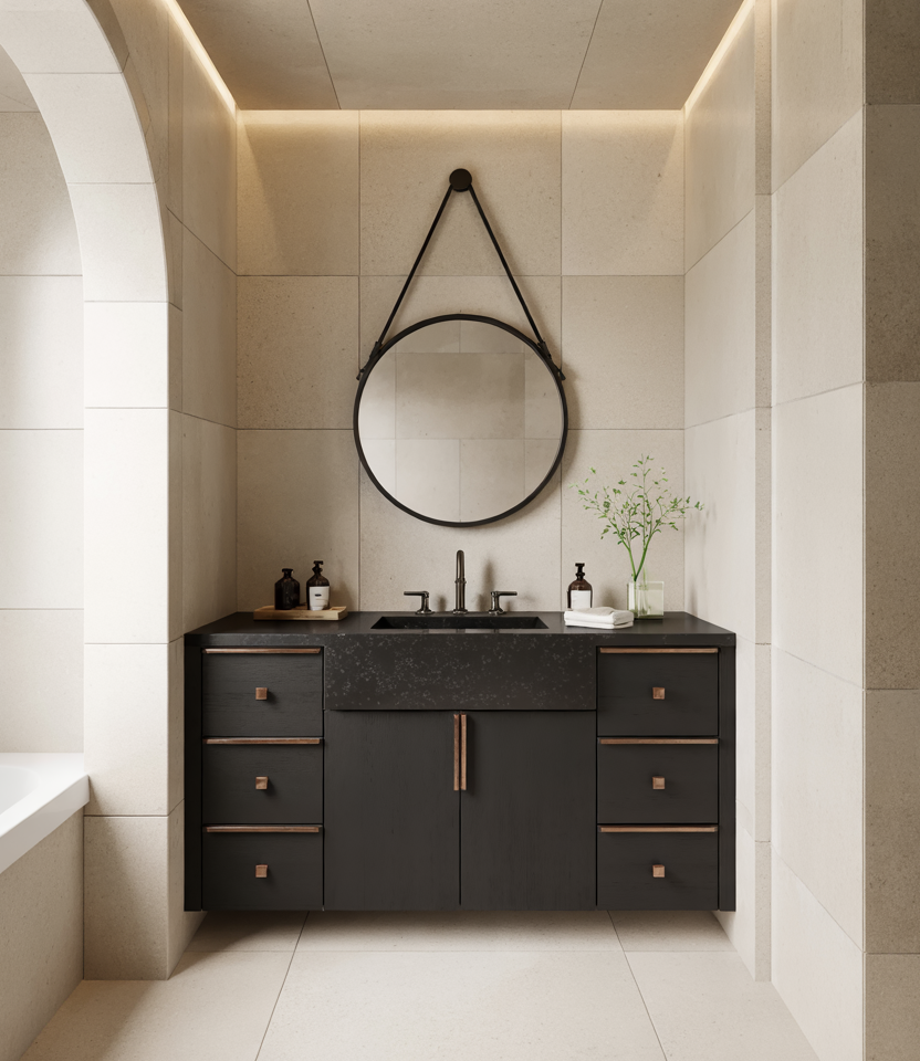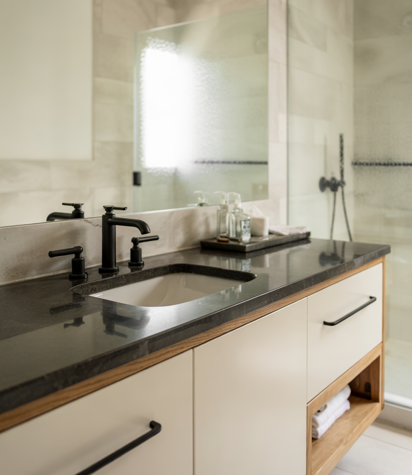 Matte black faucets, frames, and trim add crisp definition without overwhelming the room. The sleek black granite top and small modern Indian design pieces keep the look clean yet visually striking. Soft color combinations around it balance the palette. Expert-style commentary: Matte black accents work best when used sparingly—too much can flatten the room, while selective pieces sharpen the overall composition.