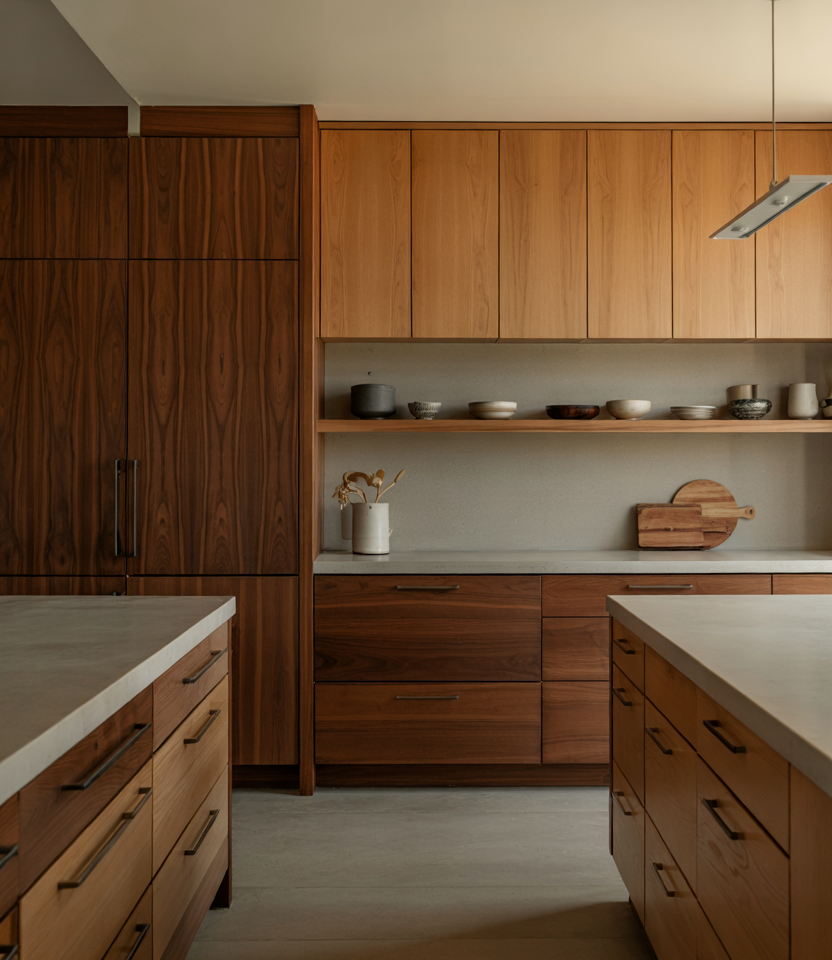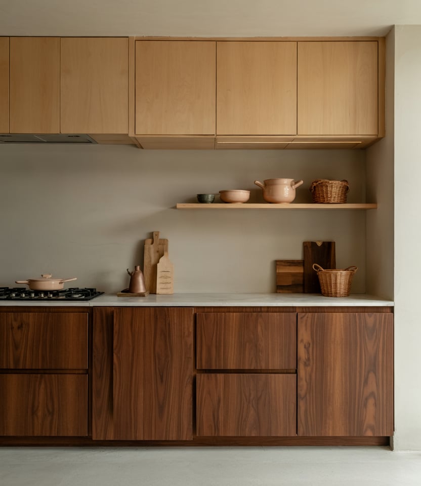 Mixing two wood species—light and mid-tone—adds instant depth. The combination feels especially fresh when framed by wooden textures and accented with subtle, modern luxury finishes for the kitchen design. Touches of open shelving keep the look relaxed rather than formal. Common mistakes and how to avoid them: avoid pairing woods with clashing undertones; instead, select hues with either a warm or cool base note in common to keep the palette harmonious.
