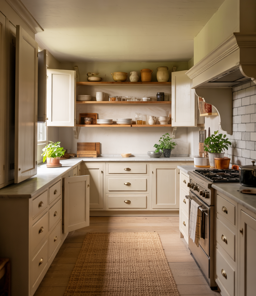 Combining modern edges with gentle curves gives transitional kitchens a lighter feel. Soft-shaped framing around cabinets pairs nicely with open shelving ideas and a curated aesthetic. Using a touch of color combination contrast helps define the space without overwhelming it. Where it works best: homes that blend older architectural details with newer updates—the hybrid style allows seamless flow between surrounding rooms.