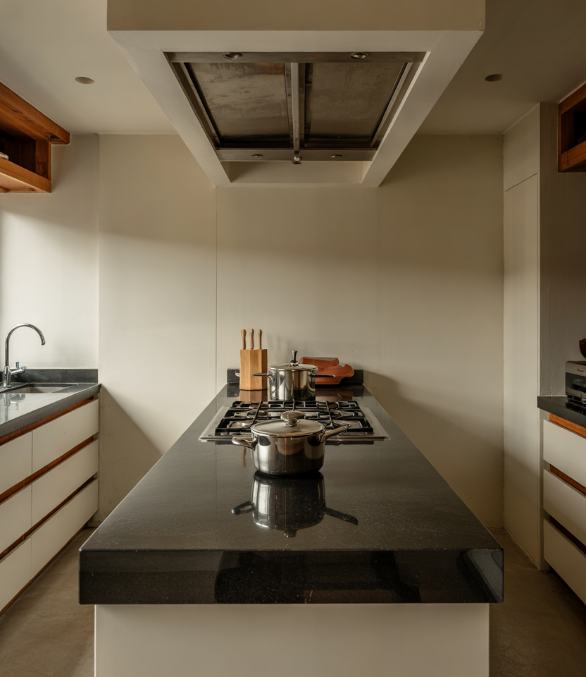 Two streamlined counters facing each other create a strong cooking workflow, especially when influenced by parallel planning and design in India’s spatial efficiency. This type of layout, for compact homes, mirrors a modern luxury small-space design approach to maximizing movement without sacrificing any storage. Where it works best: long, narrow kitchens in apartments or townhomes where every inch must stay purposeful yet calm.