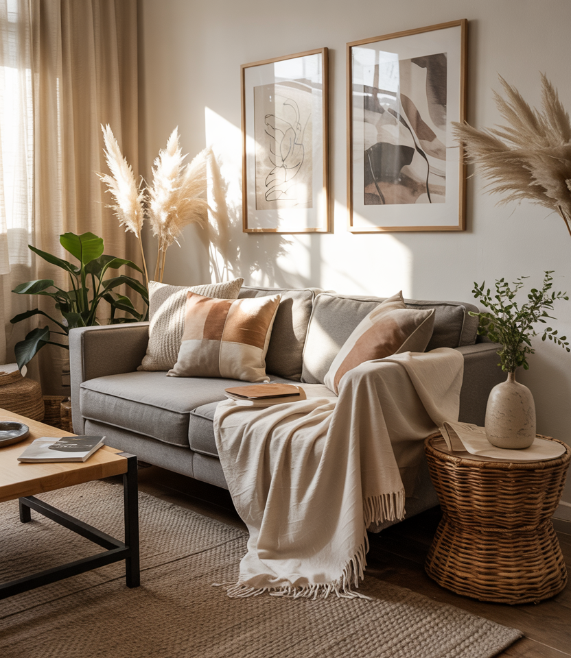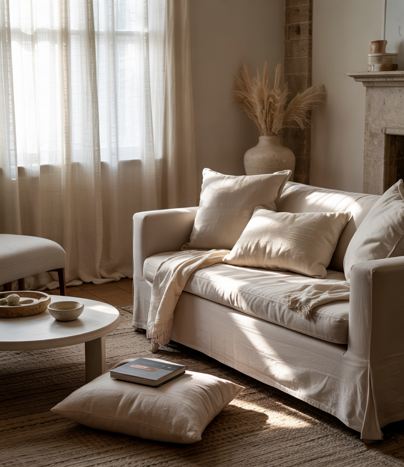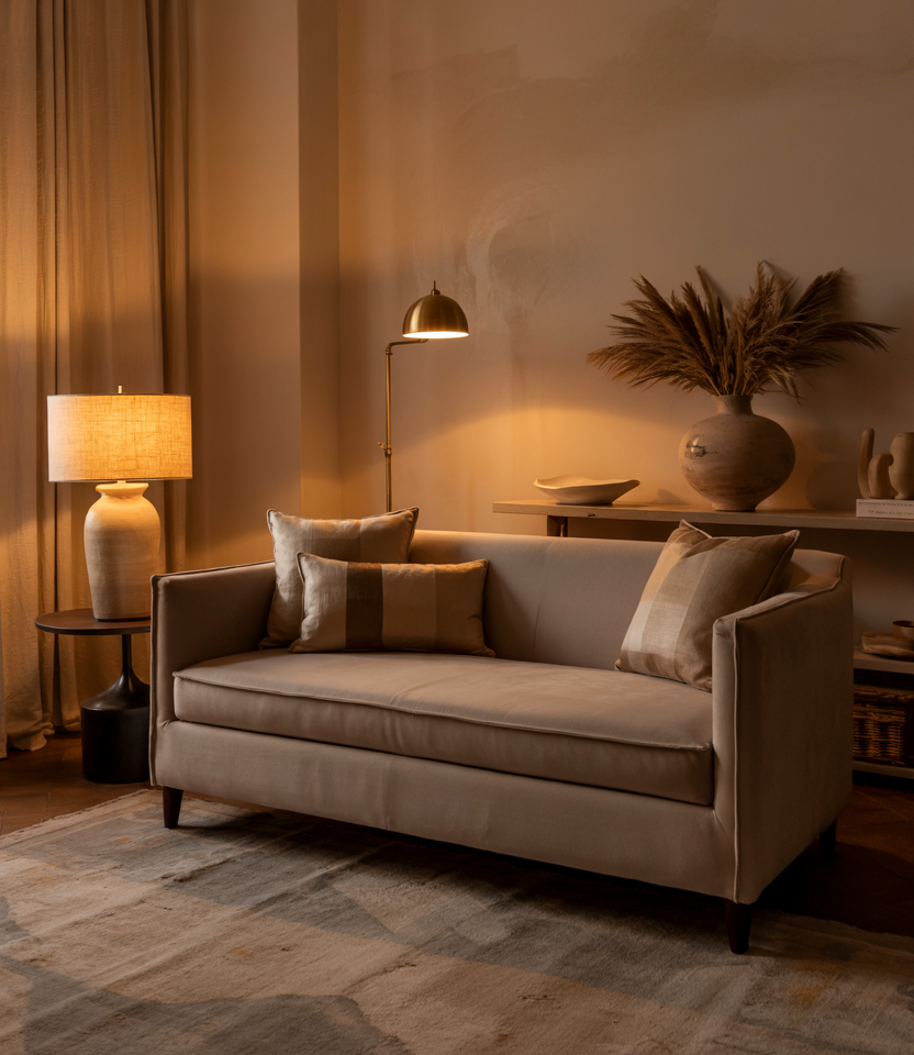 A sofa layered with varied textiles creates instant coziness, mixing soft neutrals with touches of cozy charm and subtle interior texture. This setup works beautifully in rooms that need a welcoming focal point without crowding the layout. Add throws, pillows, and natural fibers to elevate the sense of ease.