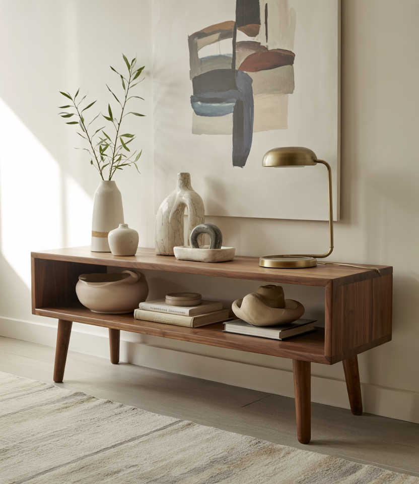A streamlined console brings a hint of retro personality and pairs effortlessly with mid-century silhouettes. Clean lines and rich wood tones create a flexible backdrop for books, pottery, or media components. This look suits living rooms that need structure without heavy furniture.