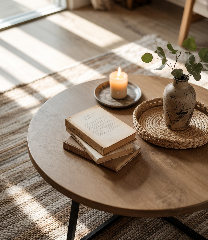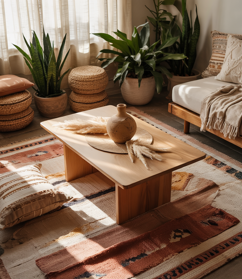 A coffee table styled with layered textures, greenery, and soft ceramics blends boho warmth with earthy simplicity. This approach creates a relaxed centerpiece that’s easy to adapt seasonally. It works especially well in rooms where visual softness helps balance strong architectural lines.