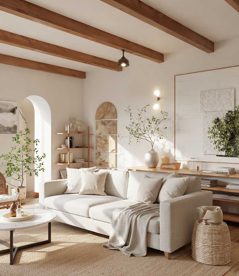 Adding faux or natural beams introduces architectural interest without heavy renovation. A mix of rustic tones and natural textures brings warmth to clean-lined living rooms. The contrast creates a space that feels both grounded and modern, especially in homes with tall ceilings.
