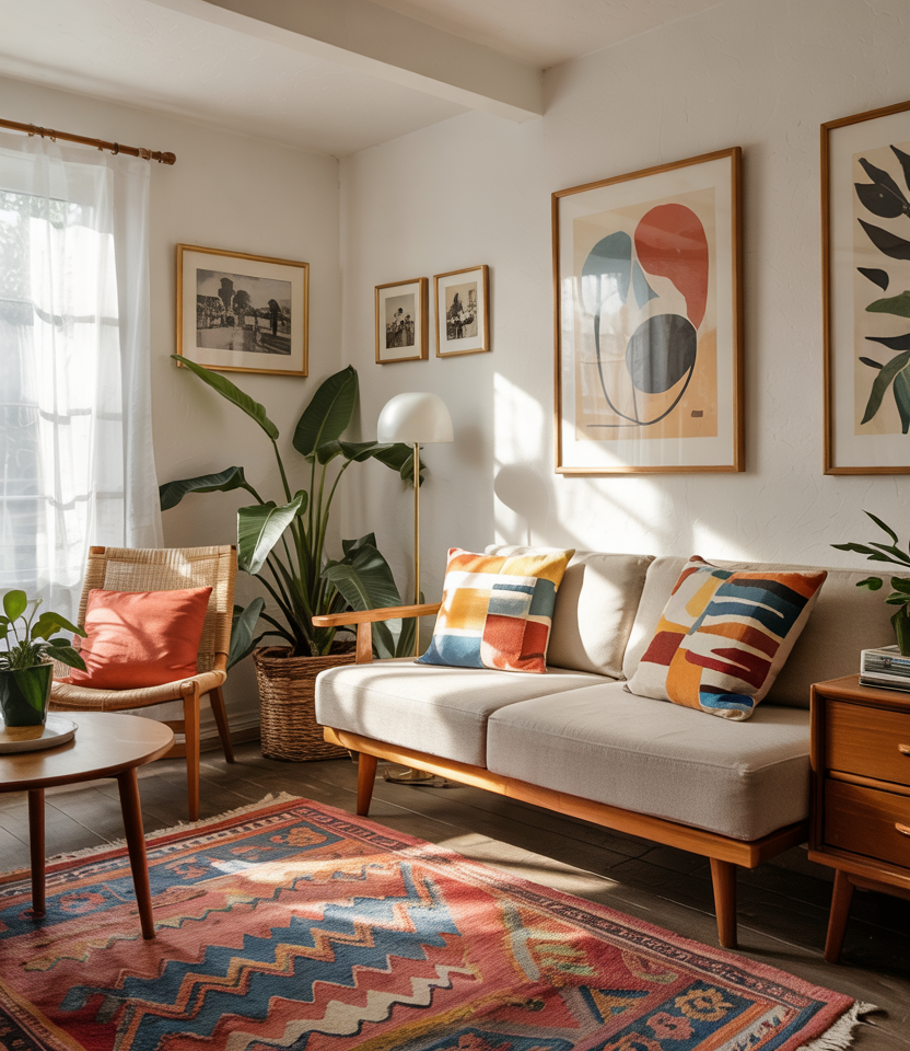 Layered rugs, warm woods, and collected décor pieces define this inviting look. The spirit of boho mid-century design blends easily with earthy materials, creating a room that feels lived-in but intentional. This approach shines in homes where creativity takes center stage and comfort is non-negotiable.