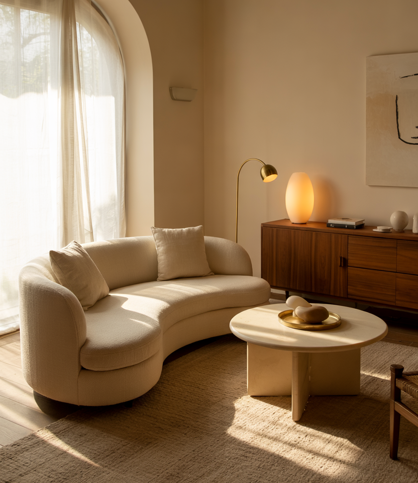 Curved seating brings movement to a space, inspired by the sculptural charm of mid-century silhouettes and the laid-back feel of boho influences. These rounded forms soften boxy layouts and instantly create a conversation-friendly environment. It’s an ideal approach for living rooms that need a touch of retro energy without going full vintage.