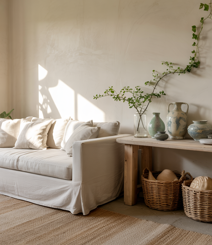 A textured neutral living room leans into calm tones and tactile layers, perfect for open-plan homes. Soft fabrics and natural fibers pair beautifully with touches of organic styling and subtle earthy accents. This idea works seamlessly in spaces that need a quiet visual anchor without sacrificing warmth or personality.