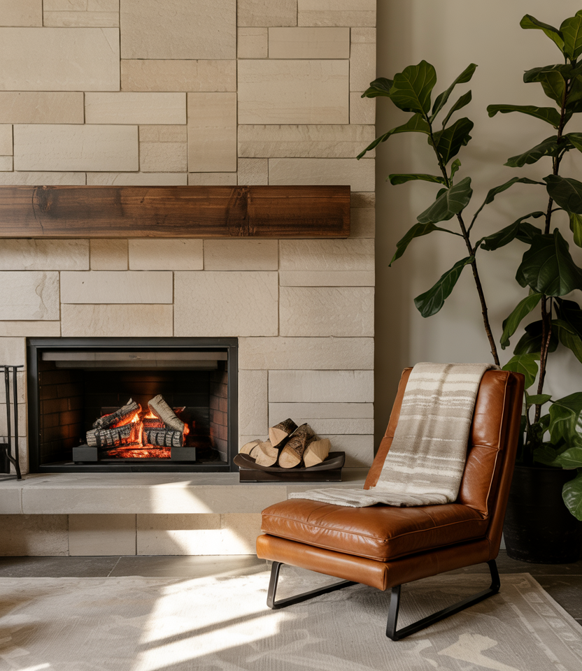 A stone fireplace reimagined with streamlined finishes brings together rustic roots and updated contemporary mid-century sensibilities. This mix feels grounded yet elevated, giving living rooms a striking focal point. It’s especially appealing if you’re drawn to natural materials but prefer a cleaner aesthetic.