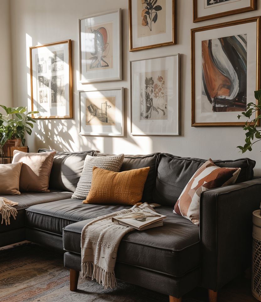 A gallery wall mixing thrifted finds and collected pieces adds charm, blending vintage character with retro spontaneity. The result feels curated yet personal, perfect for living rooms that need a touch of playful discovery. No two arrangements look alike, which makes this idea endlessly customizable.