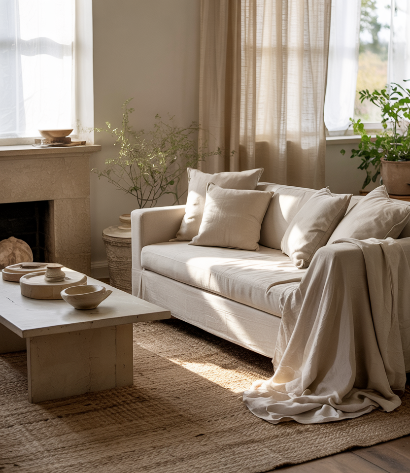A textured neutral living room leans into calm tones and tactile layers, perfect for open-plan homes. Soft fabrics and natural fibers pair beautifully with touches of organic styling and subtle earthy accents. This idea works seamlessly in spaces that need a quiet visual anchor without sacrificing warmth or personality.