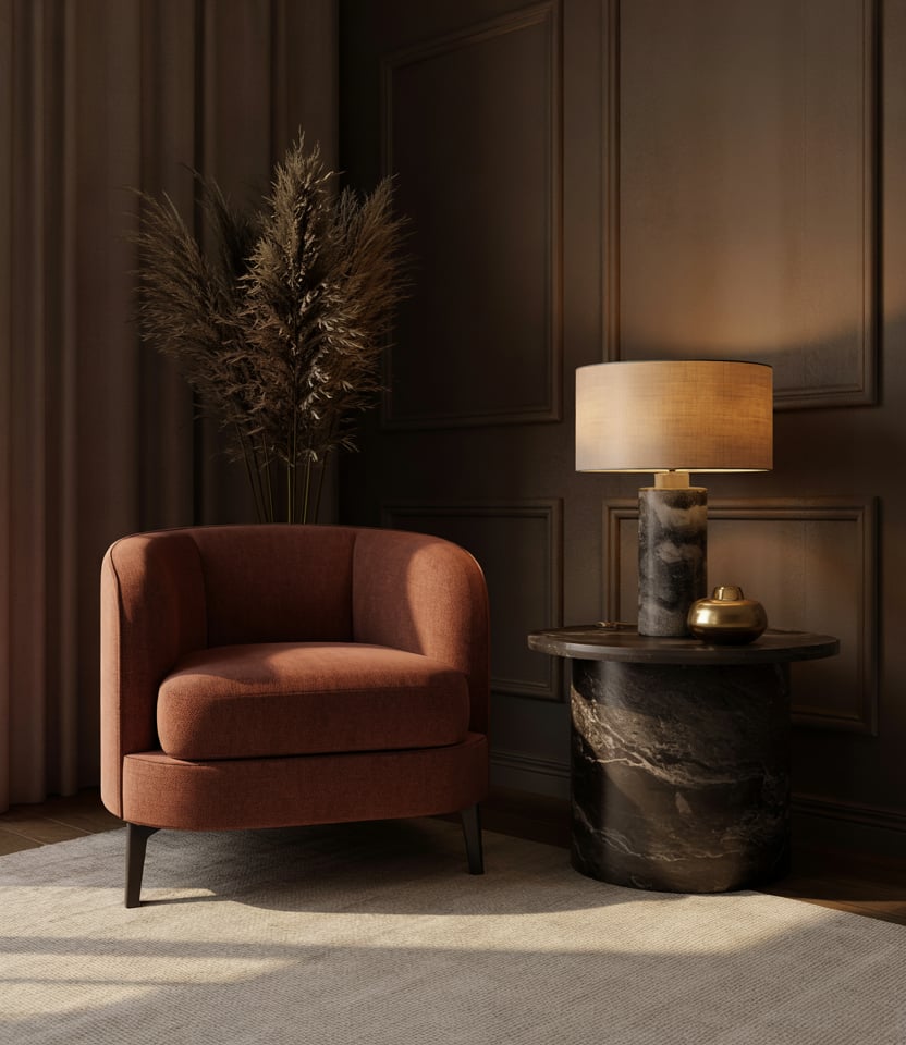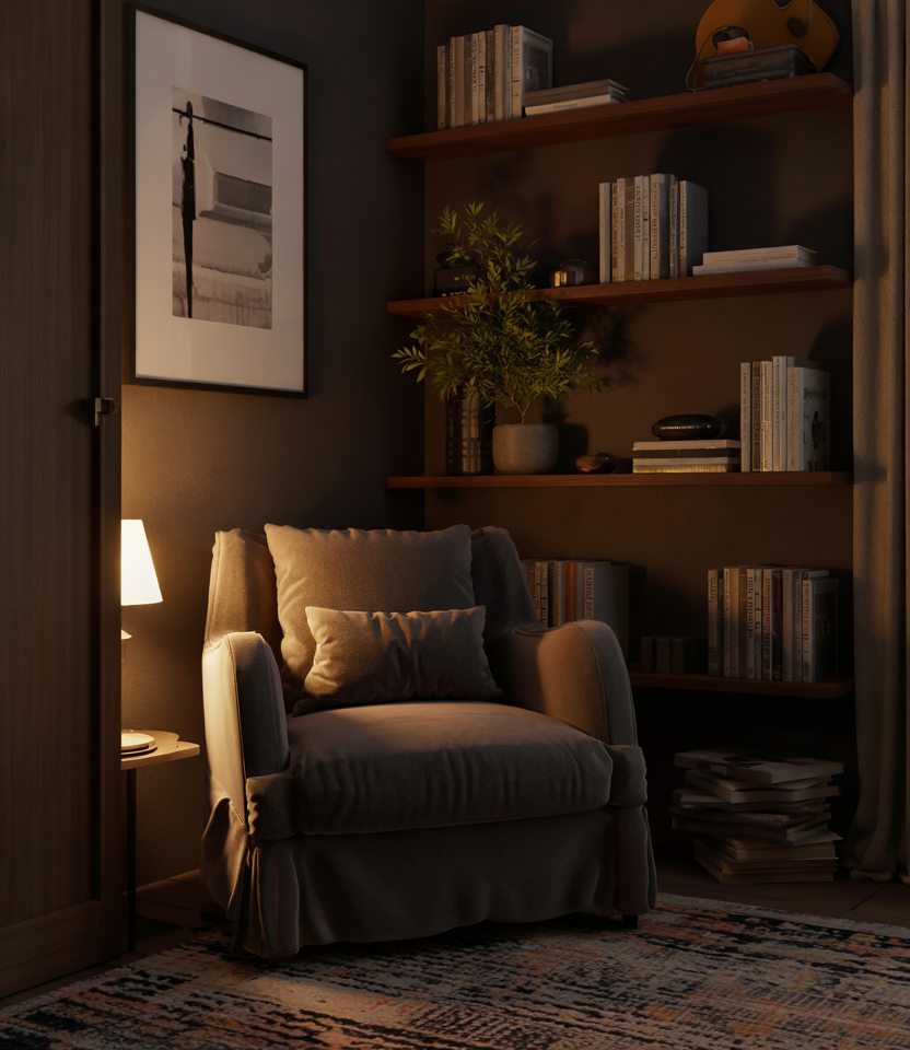 A deeply toned corner can transform a room, especially when enhanced with thoughtful lighting. Pairing rich hues with dark finishes and a hint of luxury styling delivers visual impact without overwhelming the whole space. It works beautifully for readers craving a bold moment.