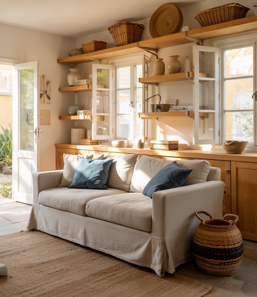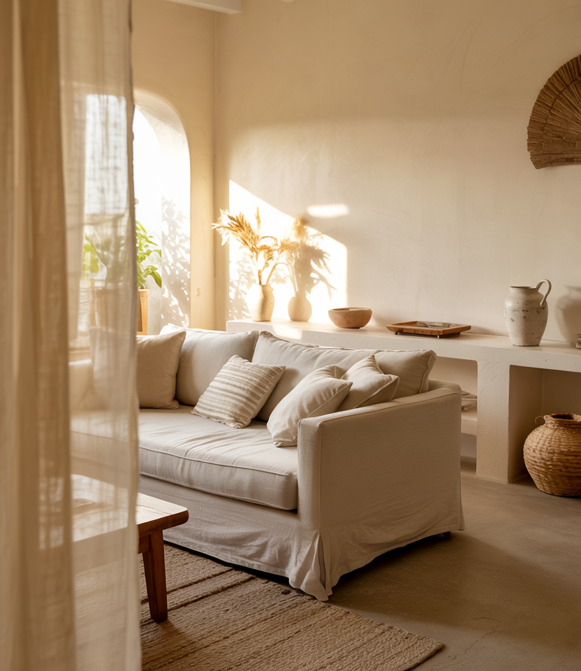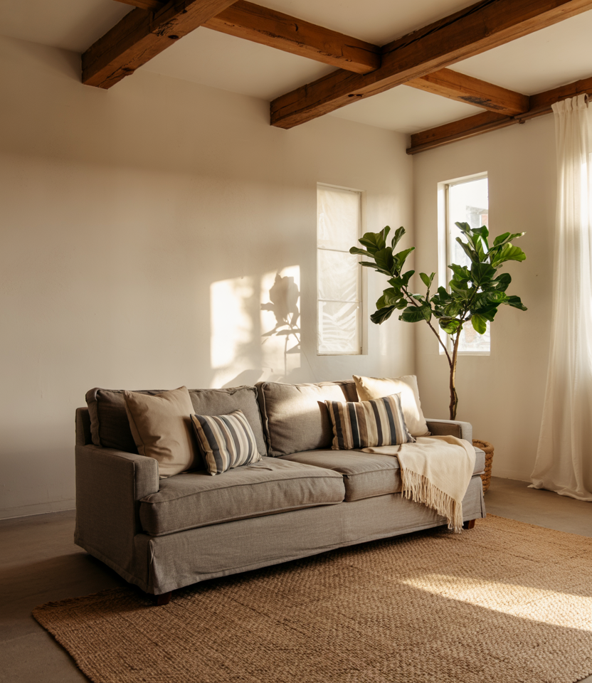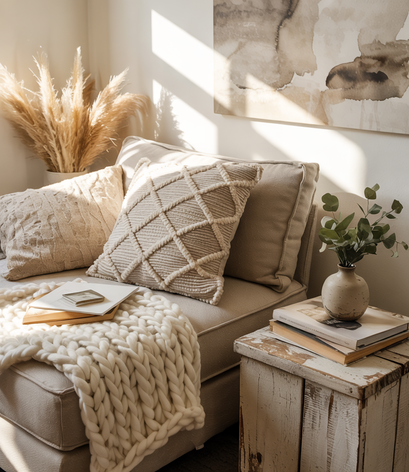A sofa layered with varied textiles creates instant coziness, mixing soft neutrals with touches of cozy charm and subtle interior texture. This setup works beautifully in rooms that need a welcoming focal point without crowding the layout. Add throws, pillows, and natural fibers to elevate the sense of ease.