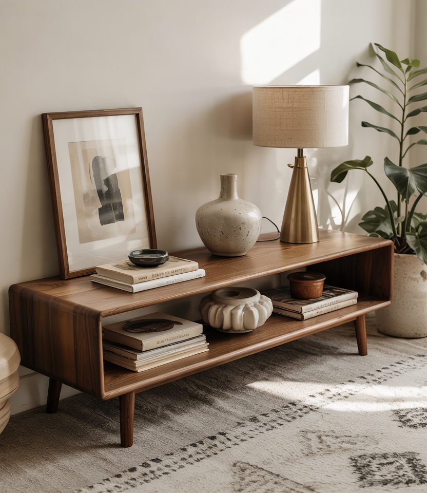 A streamlined console brings a hint of retro personality and pairs effortlessly with mid-century silhouettes. Clean lines and rich wood tones create a flexible backdrop for books, pottery, or media components. This look suits living rooms that need structure without heavy furniture.