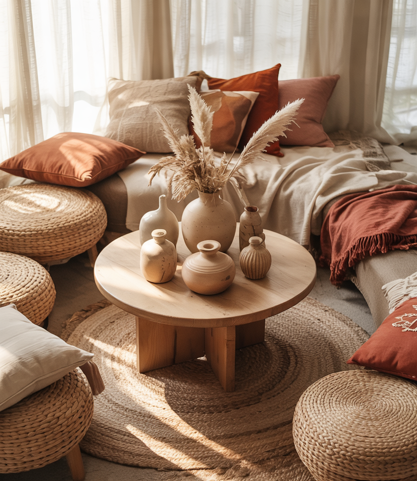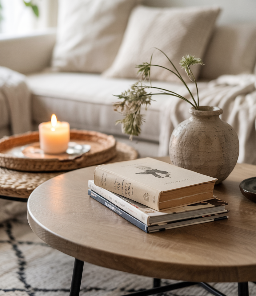 A coffee table styled with layered textures, greenery, and soft ceramics blends boho warmth with earthy simplicity. This approach creates a relaxed centerpiece that’s easy to adapt seasonally. It works especially well in rooms where visual softness helps balance strong architectural lines.