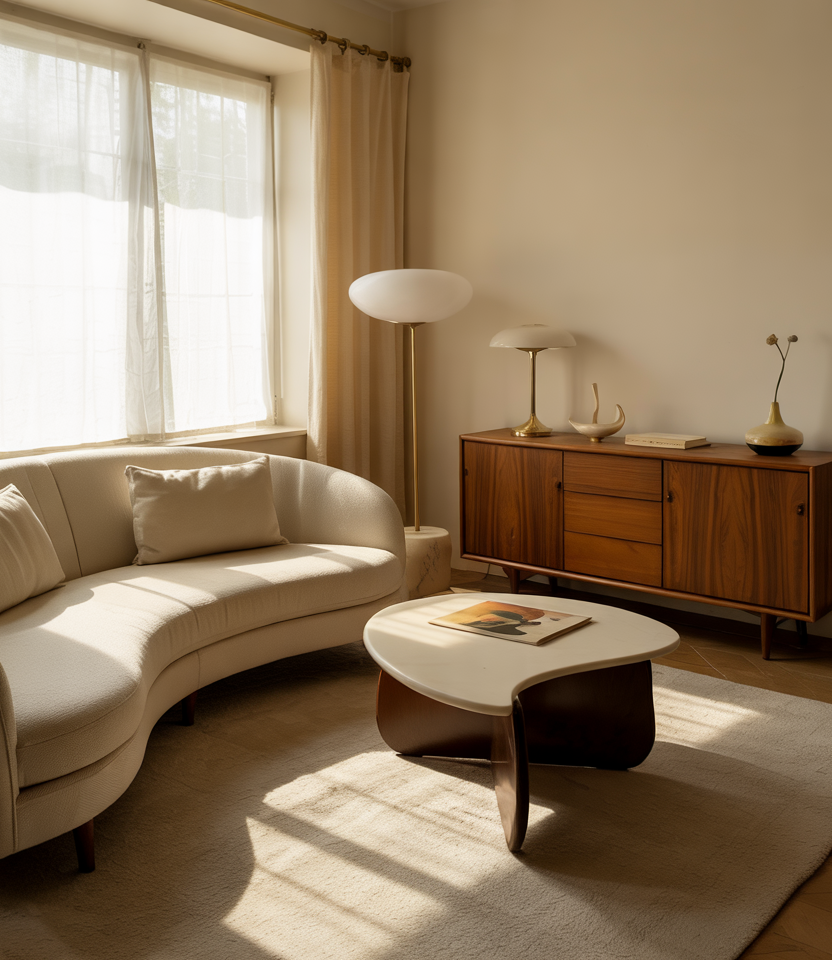 Curved seating brings movement to a space, inspired by the sculptural charm of mid-century silhouettes and the laid-back feel of boho influences. These rounded forms soften boxy layouts and instantly create a conversation-friendly environment. It’s an ideal approach for living rooms that need a touch of retro energy without going full vintage.