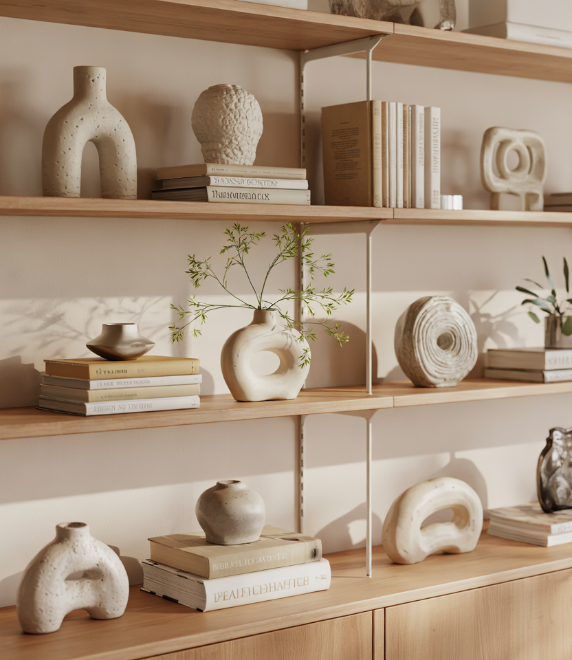 Open shelves become artful when styled with layered textures, sculptural shapes, and a gentle mix of organic elements. Pair neutral palettes with subtle greenery to invite a sense of calm. Touches of collected objects add a feeling of inspiration while maintaining a clean, natural aesthetic that blends effortlessly into modern homes.