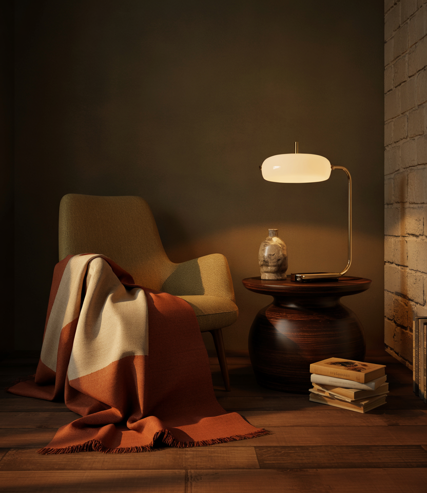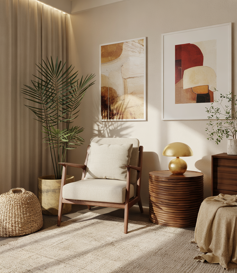 A dedicated reading nook brings warmth and intention to daily routines. A tapered-leg chair, moody lamp, and layered textiles combine the charm of cozy mid-century style with a touch of moody organic softness. The look encourages slow moments and adds depth to larger living rooms.