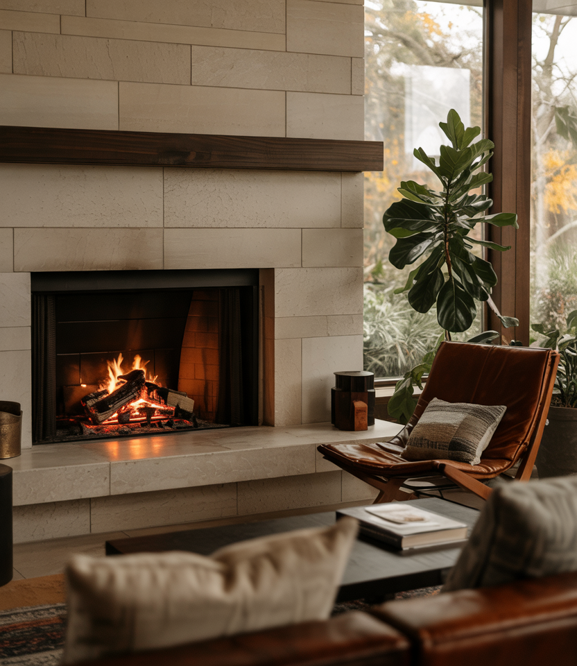 A stone fireplace reimagined with streamlined finishes brings together rustic roots and updated contemporary mid-century sensibilities. This mix feels grounded yet elevated, giving living rooms a striking focal point. It’s especially appealing if you’re drawn to natural materials but prefer a cleaner aesthetic.