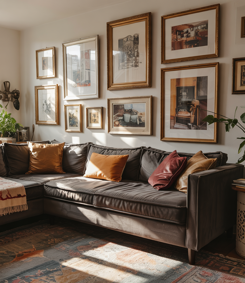 A gallery wall mixing thrifted finds and collected pieces adds charm, blending vintage character with retro spontaneity. The result feels curated yet personal, perfect for living rooms that need a touch of playful discovery. No two arrangements look alike, which makes this idea endlessly customizable.