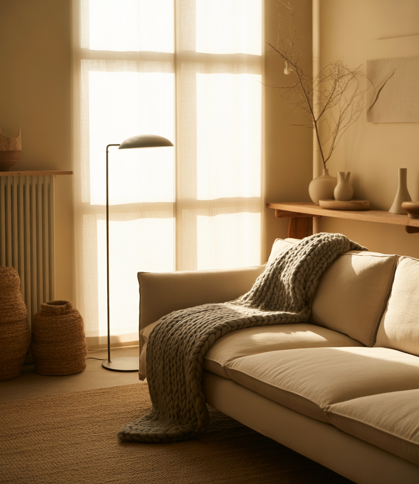 Neutral spaces work beautifully for shared homes because they’re adaptable. Layering beiges, creams, and soft textures creates harmony without leaning overly masculine or feminine. Quiet gender neutrality blends easily with cozy layers and even small blue undertones when desired.