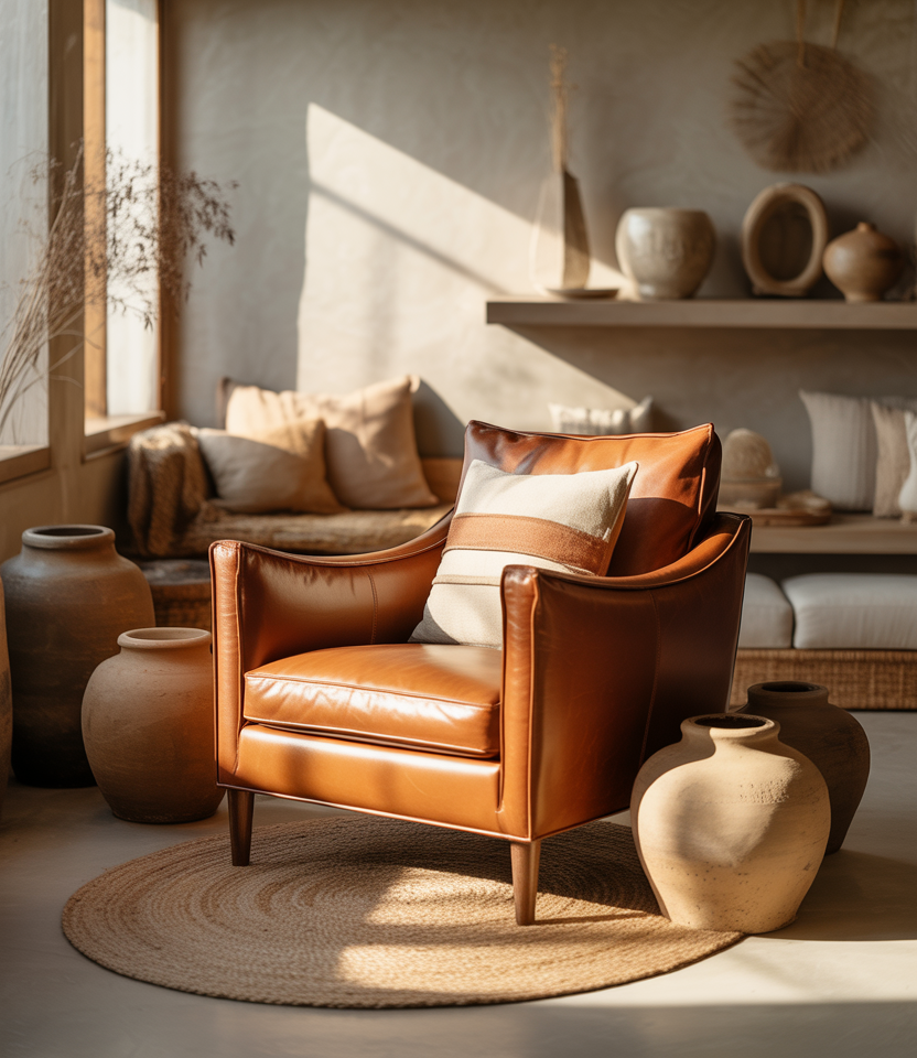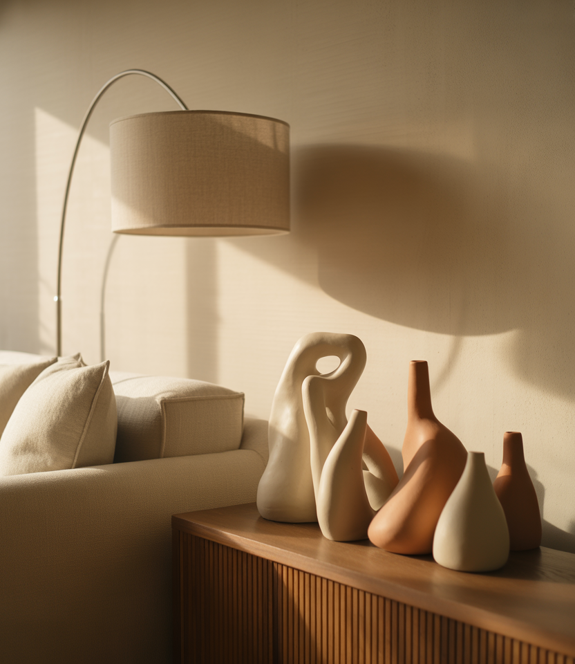 Neutral living rooms gain quiet drama when sculptural pieces come into play. Curved vases, organic-shaped lamps, and textured wall art bring subtle dimension without disturbing the calm. Blending soft forms with organic finishes, warm brown touches, and light cozy layers keeps the room grounded yet artistic.