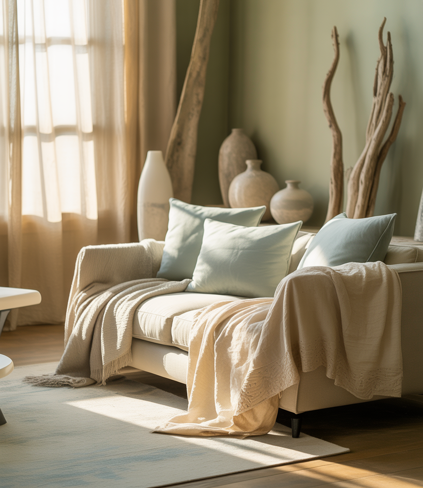A gentle blue undertone can refresh a neutral setting without dominating. Think icy greys with subtle blue, soft sky-toned pillows, or an understated vase. Combining blue and sandy neutrals alongside small green accents and a touch of crafted inspiration makes the palette feel breezy yet cohesive.