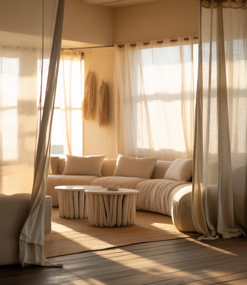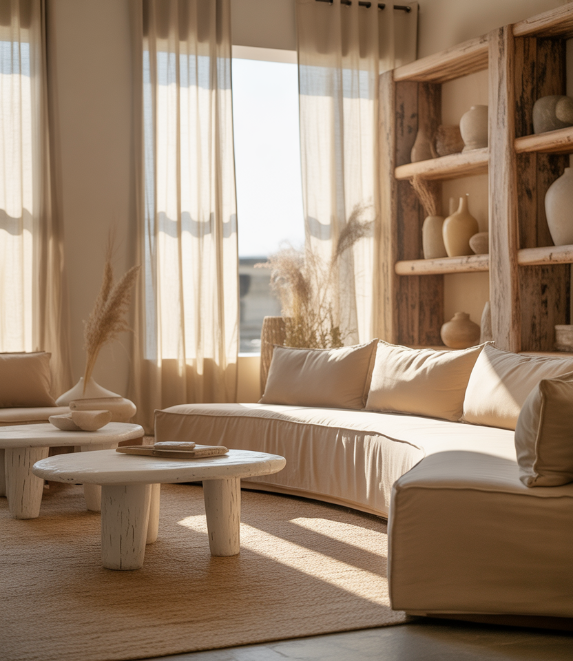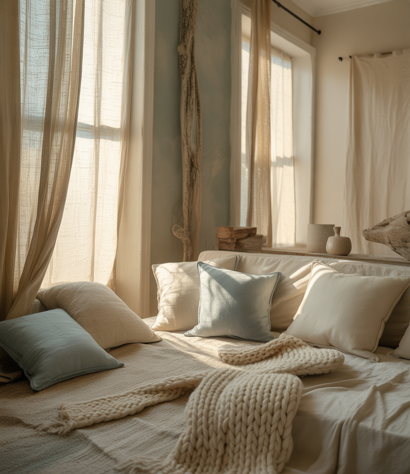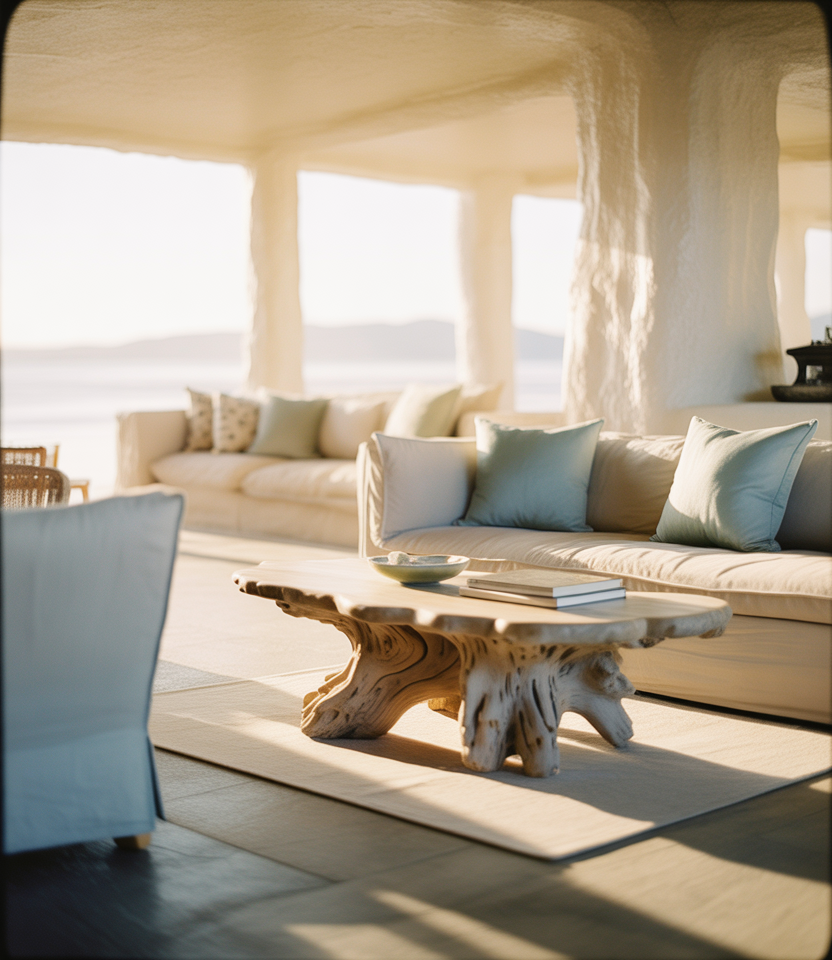 You don’t need shells or nautical décor to evoke the coast. Gentle curves, breezy fabrics, and sandy hues create a subtly coastal mood. Integrating coastal touches with creamy neutrals and hints of earthy decor tones, along with adding light, can transform a room into a peaceful retreat.