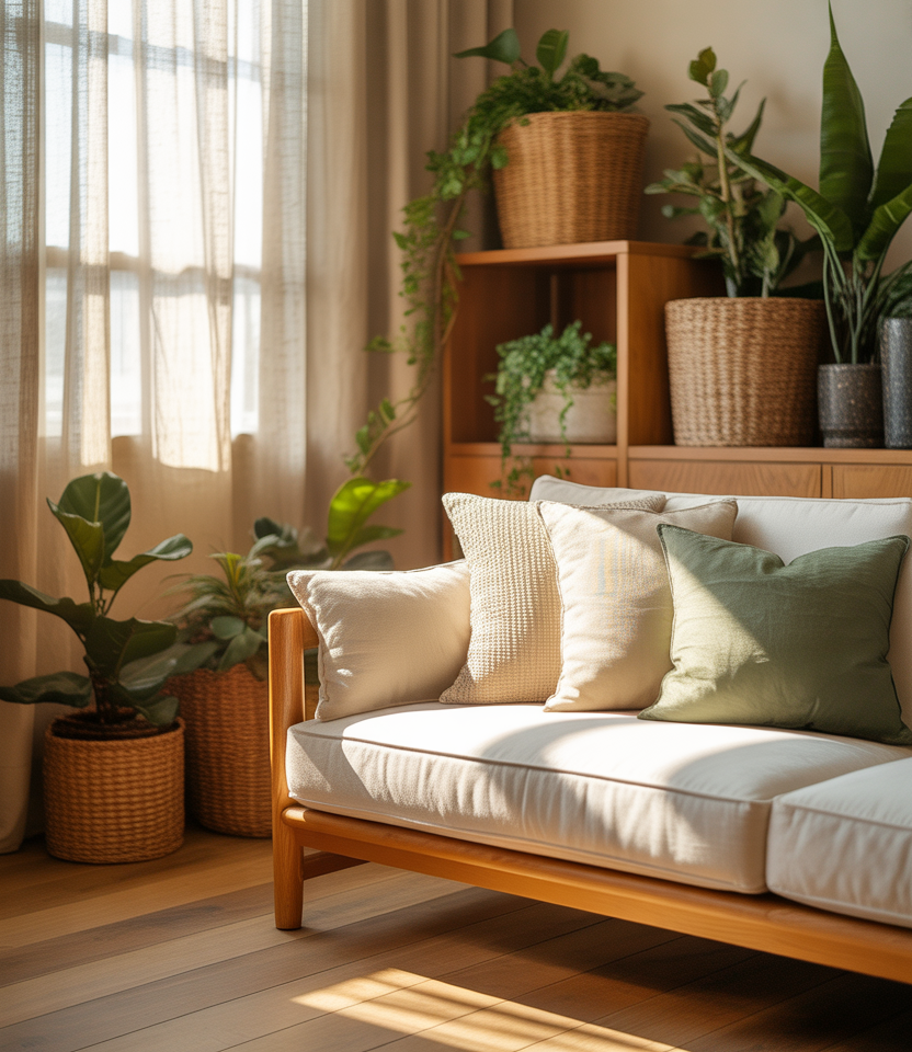 Botanical textures—linen drapery, leafy prints, and natural fibers—bring life to a neutral setting. They soften straight lines and add movement to quiet spaces. Blending organic motifs with subtle green accents and touches of earthy warmth creates a peaceful, nature-inspired room.